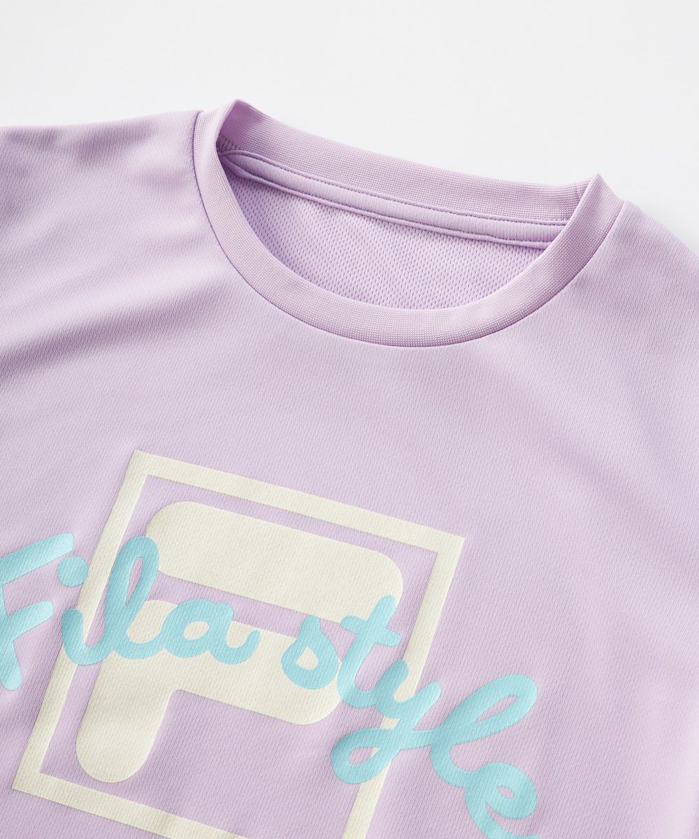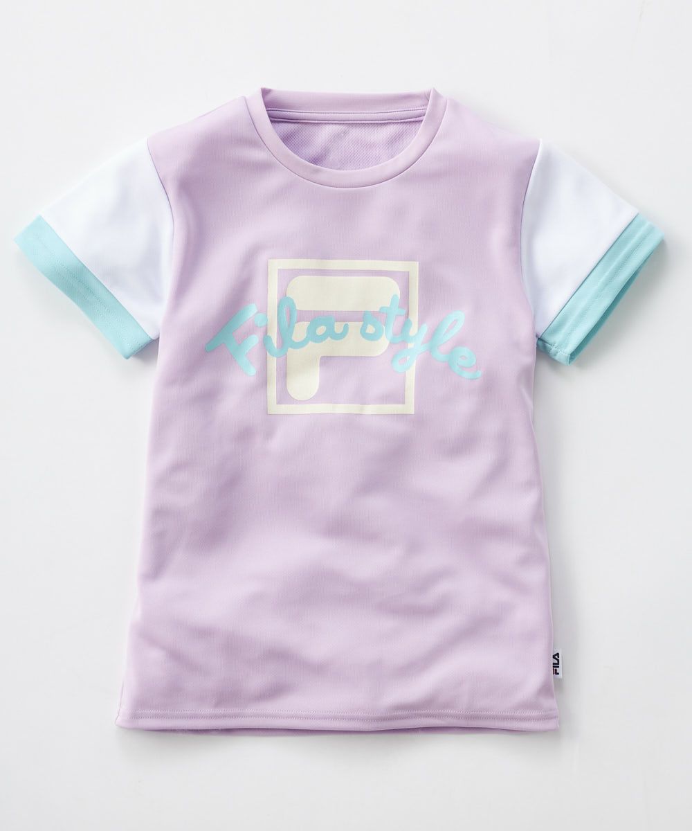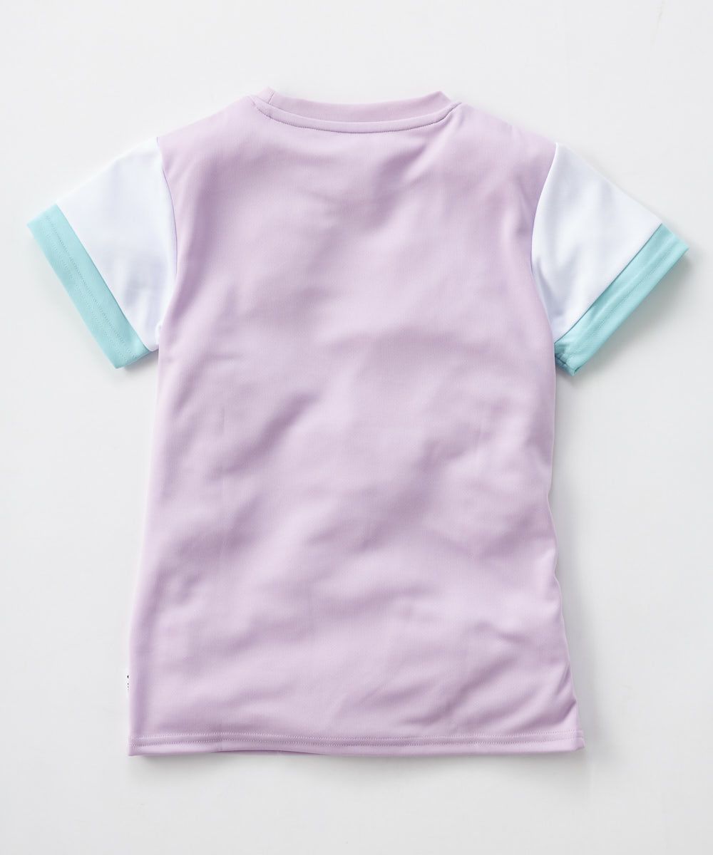 パステルカラーのプリントTシャツ。手描き風ロゴが可愛く、袖の配色切り替えがアクセントになり、甘くなり 過ぎないデザインになっています。サラッとした肌触りの素材がアクティブなシーンにお勧めです。