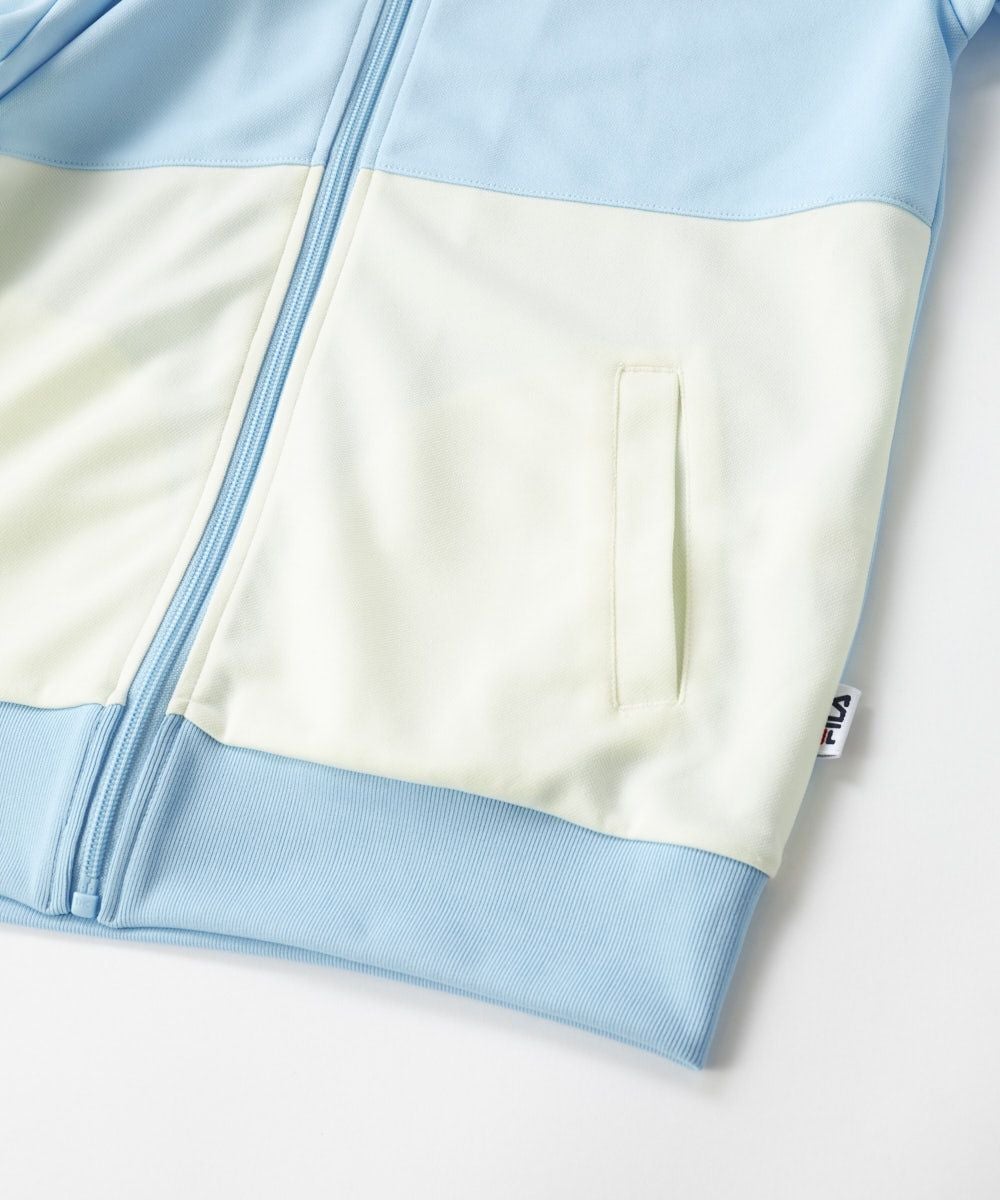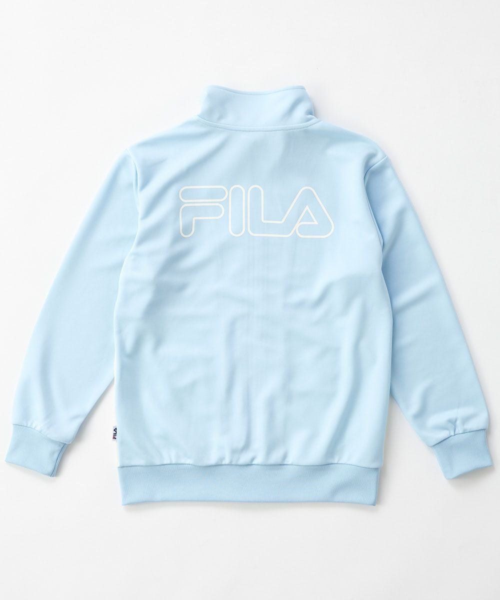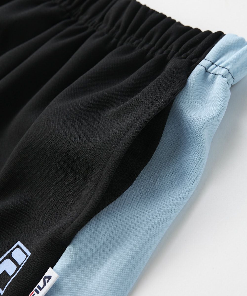 バイカラー切り替えのトップスとライン入りボトムの上下セット。背中のFILAロゴがポイントになっています。