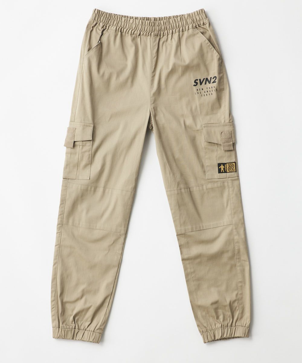 両サイドにポケットが付いたカーゴ風のストレッチツイルパンツ。今期はダメージが出やすい膝部分を2枚仕立 てで補強してバージョンアップさせました。裾が絞られているので多少大きくても履きこなしやすい仕様になっ ています。