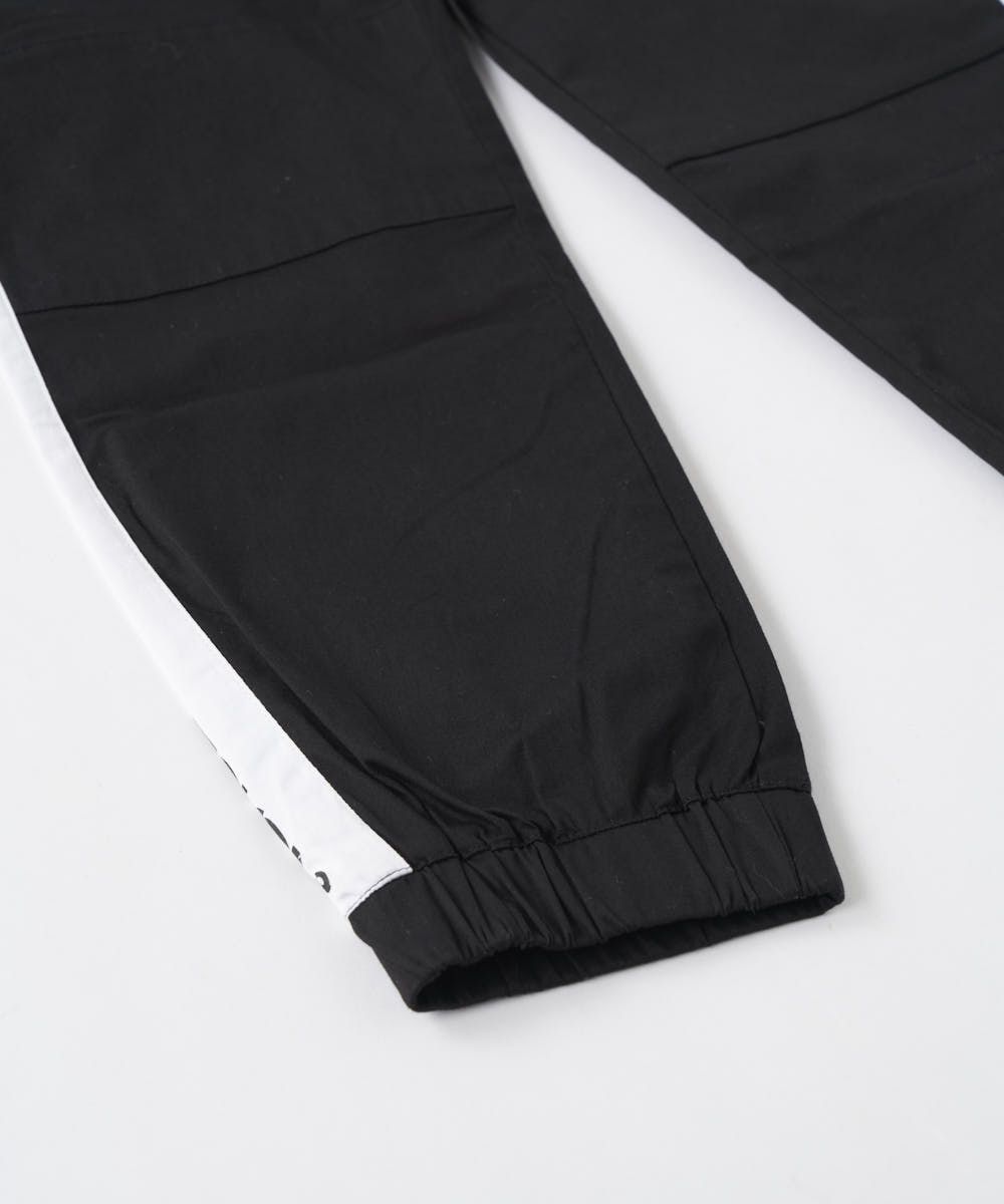 両サイドのロゴテープがデザインアクセントのストレッチツイルパンツ。今期はダメージが出やすい膝部分を2 枚仕立てで補強してバージョンアップさせました。裾が絞られているので多少大きくても履きこなしやすい仕様 になっています。