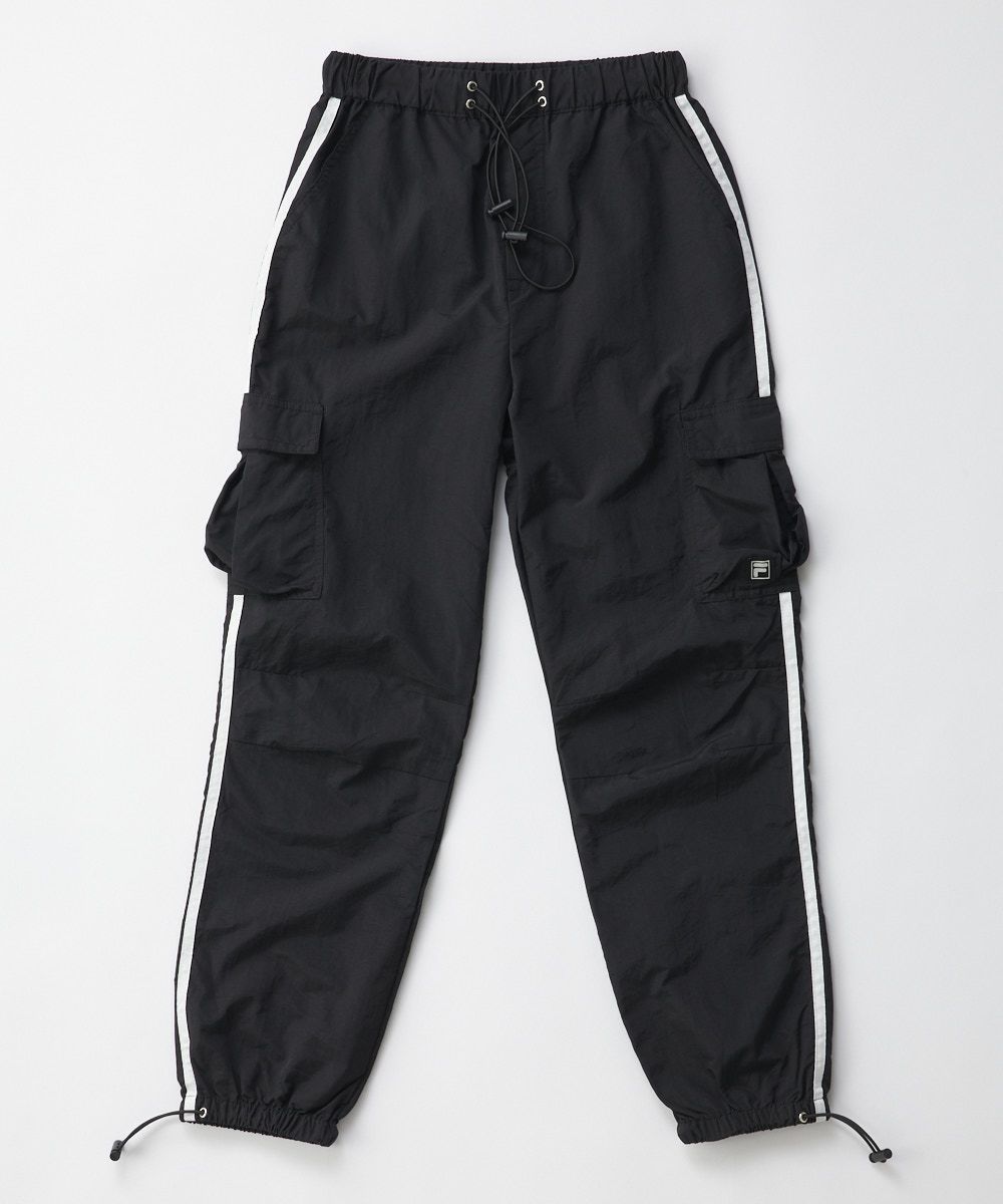 張りのあるナイロン素材を使ったメンズライクなカーゴパンツです。ドローコードで調節もできます。モノトー ンカラーで使い勝手もよくダンスウエアからカジュアルまで幅広く使えるアイテムです。