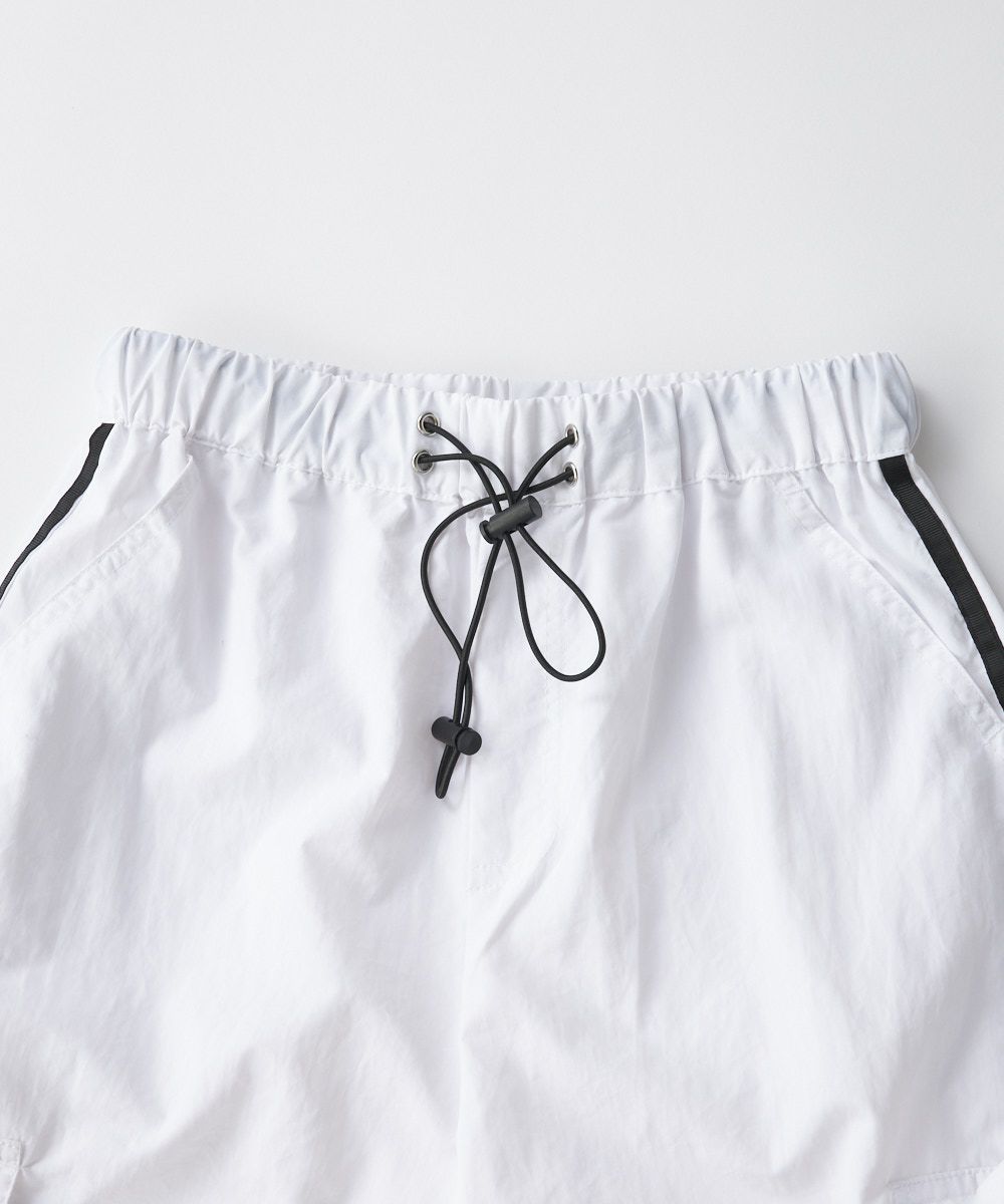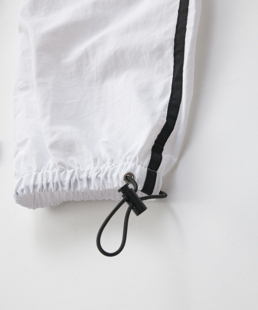 張りのあるナイロン素材を使ったメンズライクなカーゴパンツです。ドローコードで調節もできます。モノトー ンカラーで使い勝手もよくダンスウエアからカジュアルまで幅広く使えるアイテムです。