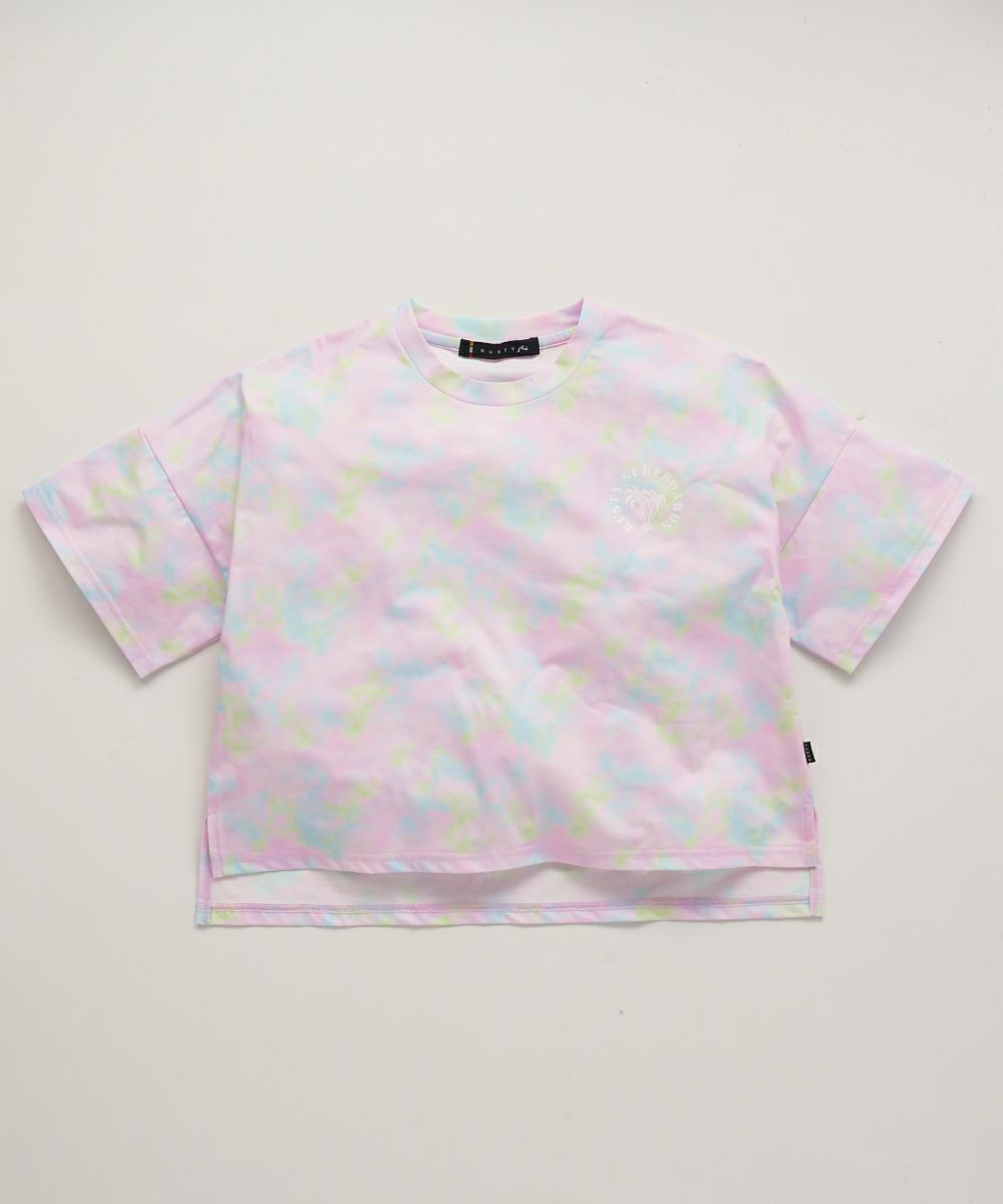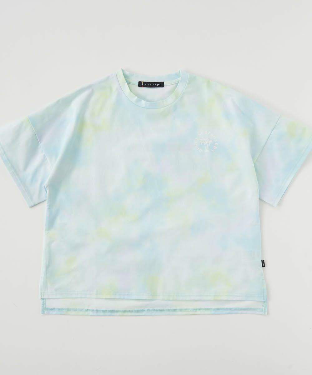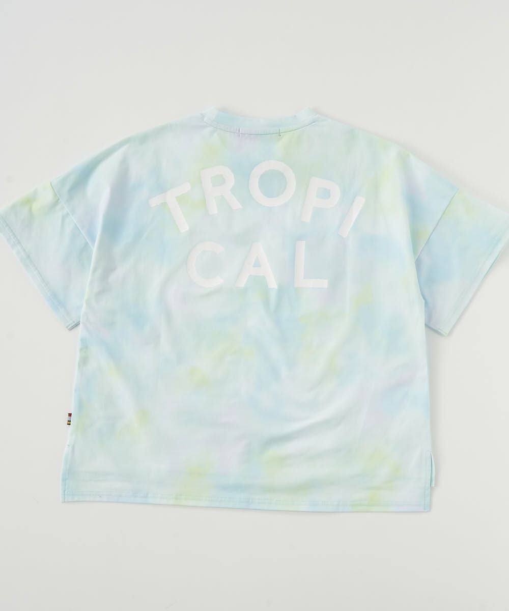 吸水/速乾性も良く、紫外線を90%以上カットする機能性に優れたラッシュガードTシャツ。パステルカラーのタイダイ総柄で胸と背中にはトロピカルグラフィックをプリント。