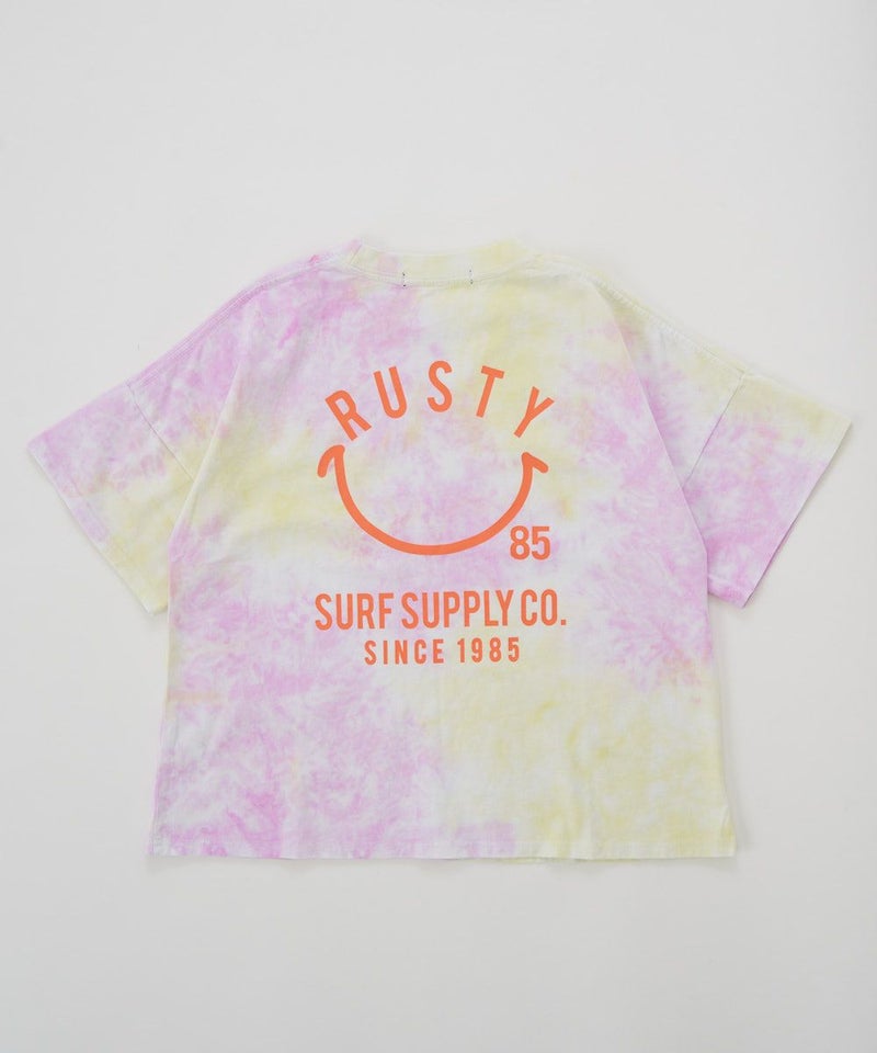 タイダイ柄とバックのニコちゃんプリントがかわいすぎるキッズTシャツ。ドロップショルダーなのでルーズにおしゃれに着こなせます!デニムとの相性◎