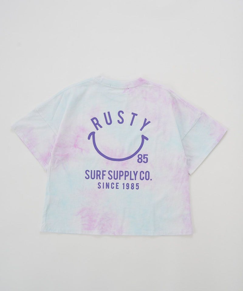 タイダイ柄とバックのニコちゃんプリントがかわいすぎるキッズTシャツ。ドロップショルダーなのでルーズにおしゃれに着こなせます!デニムとの相性◎