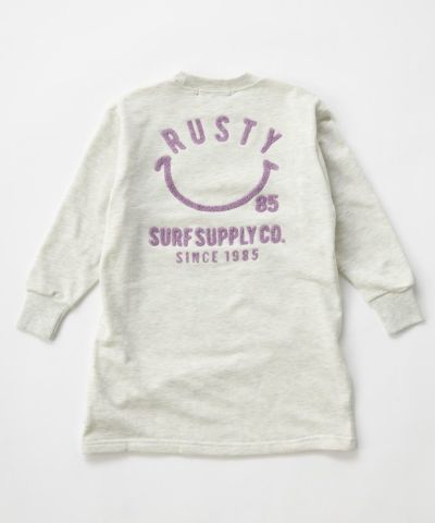 バックにブランドロゴとニコちゃんがプリントされているスウェットワンピース