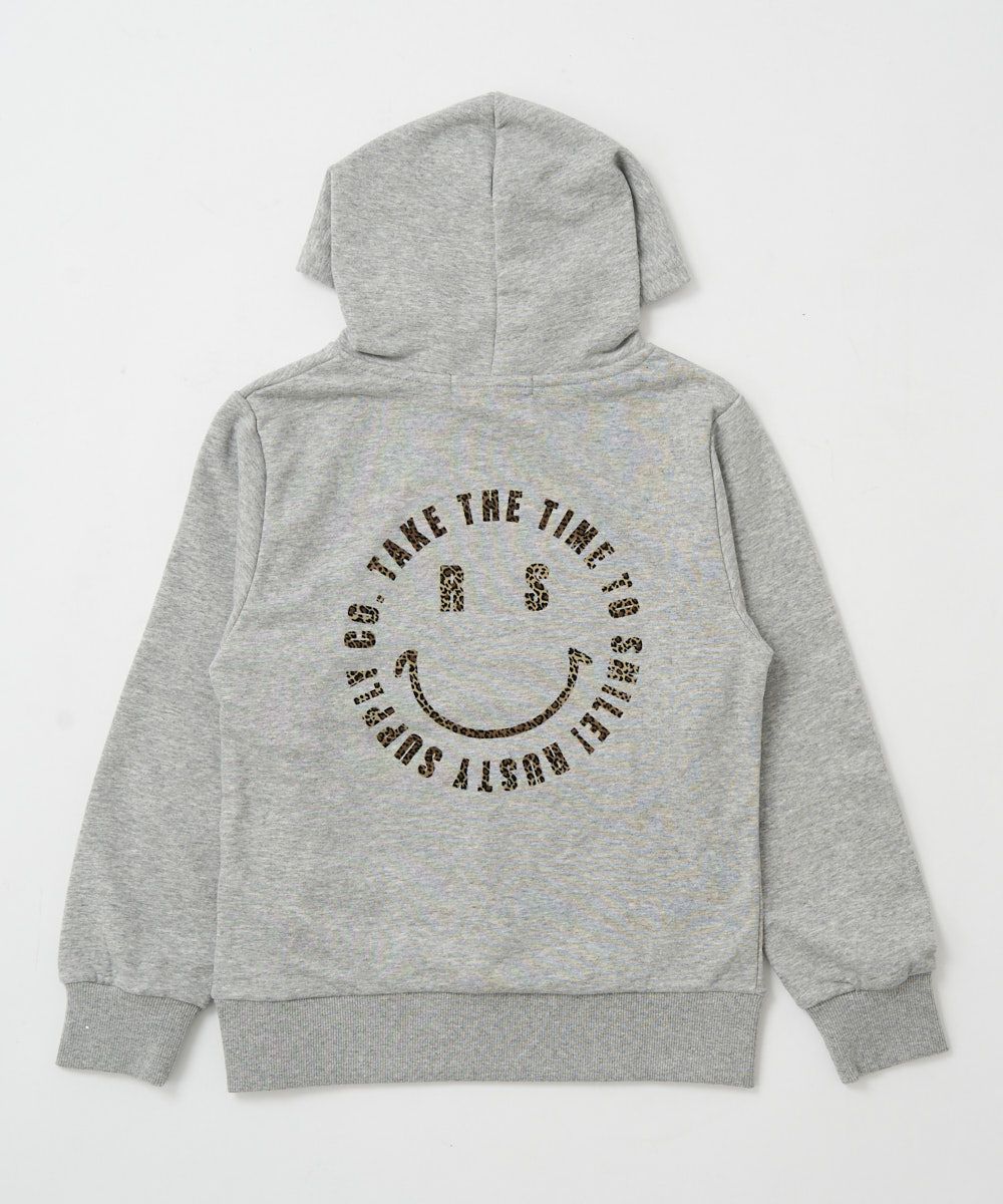 おしゃれなヒョウ柄フロッキーと売れ筋のニコちゃん柄を組み合わせた裏毛プルパーカー。着心地も◎。 デイリーコーデに欠かせないアイテムです。