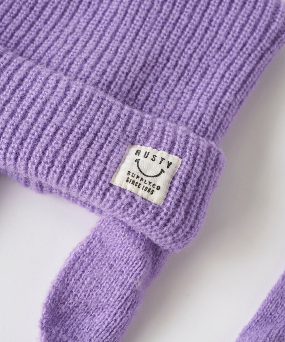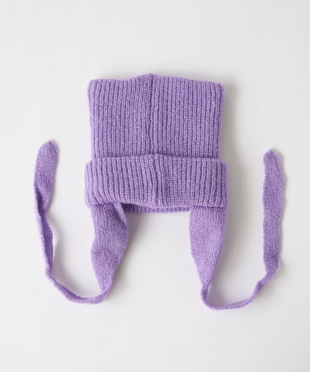 着用時に猫耳のように見えるスクエアニットキャップ!紐が付いていてお耳もあったか。リボン結びにしても可愛いニット帽です。ニコちゃんピスネームがポイントに。