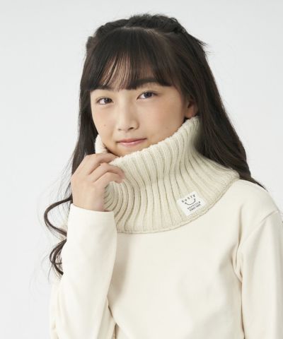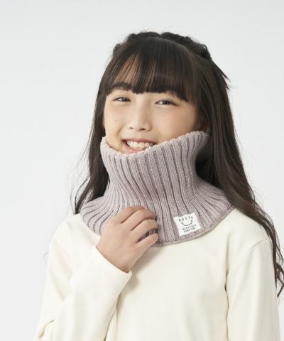 柔らかなリブニットのネックウォーマーで首元あったか。ニコちゃんマークのピスネームがさりげなくポイント。