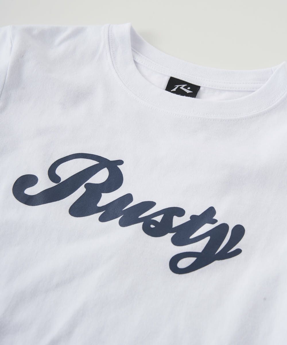 大きなロゴプリントが目をひくTシャツ。背中にはRUSTY定番のニコちゃんを施し、バックスタイルもオシャレに決まります。