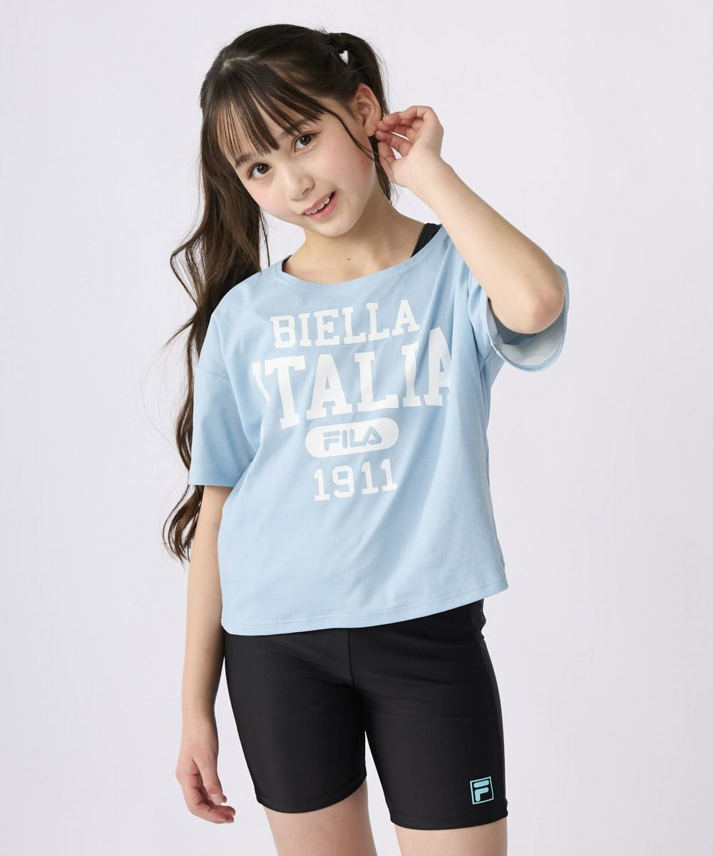 セパレートタンキニタイプのスクール水着に水陸両用のTシャツが付いたお得なセット。シンプルなベースカラーに可愛らしい配色の水着と人気のカレッジプリントTシャツは、学校や習い事、レジャー、リゾートにも大活躍します。捲れ防止バインダー付きなので、安心して着用できます。※140cm~パット差し込み対応が可能なの で、お持ちのパットをご利用ください。