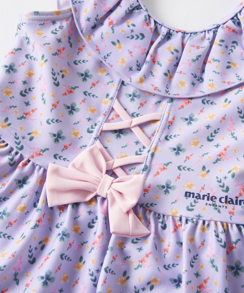 Uネックのデザインと、編み上げとリボンがかわいいAライン水着。ショーツ一体型で着用しやすいのポイント。編上げリボンに襟がポイントのガーリーなデザイン。マリ・ クレールらしい上品な花柄もおすすめポイントです!