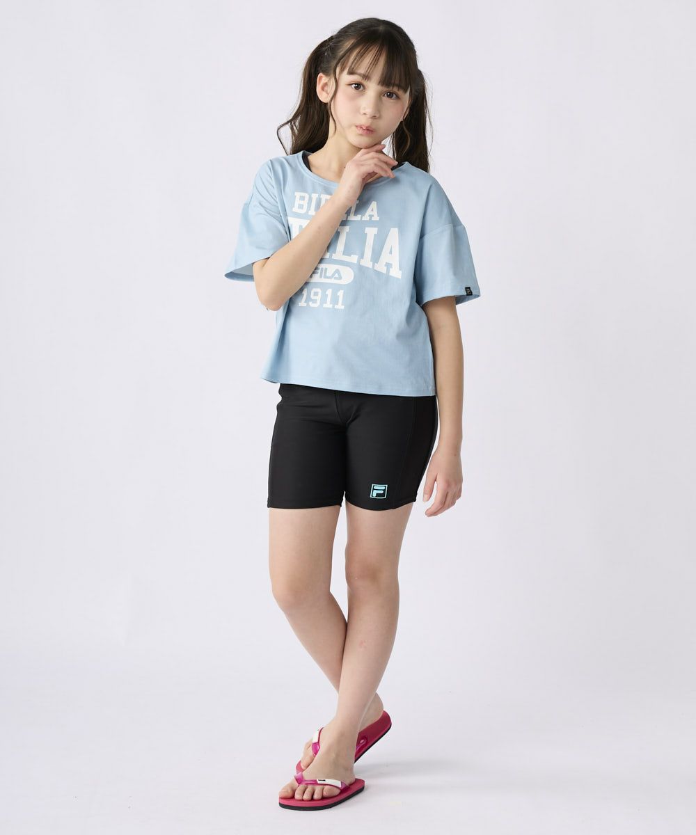 セパレートタンキニタイプのスクール水着に水陸両用のTシャツが付いたお得なセット。シンプルなベースカラーに可愛らしい配色の水着と人気のカレッジプリントTシャツは、学校や習い事、レジャー、リゾートにも大活躍します。捲れ防止バインダー付きなので、安心して着用できます。※140cm~パット差し込み対応が可能なの で、お持ちのパットをご利用ください。
