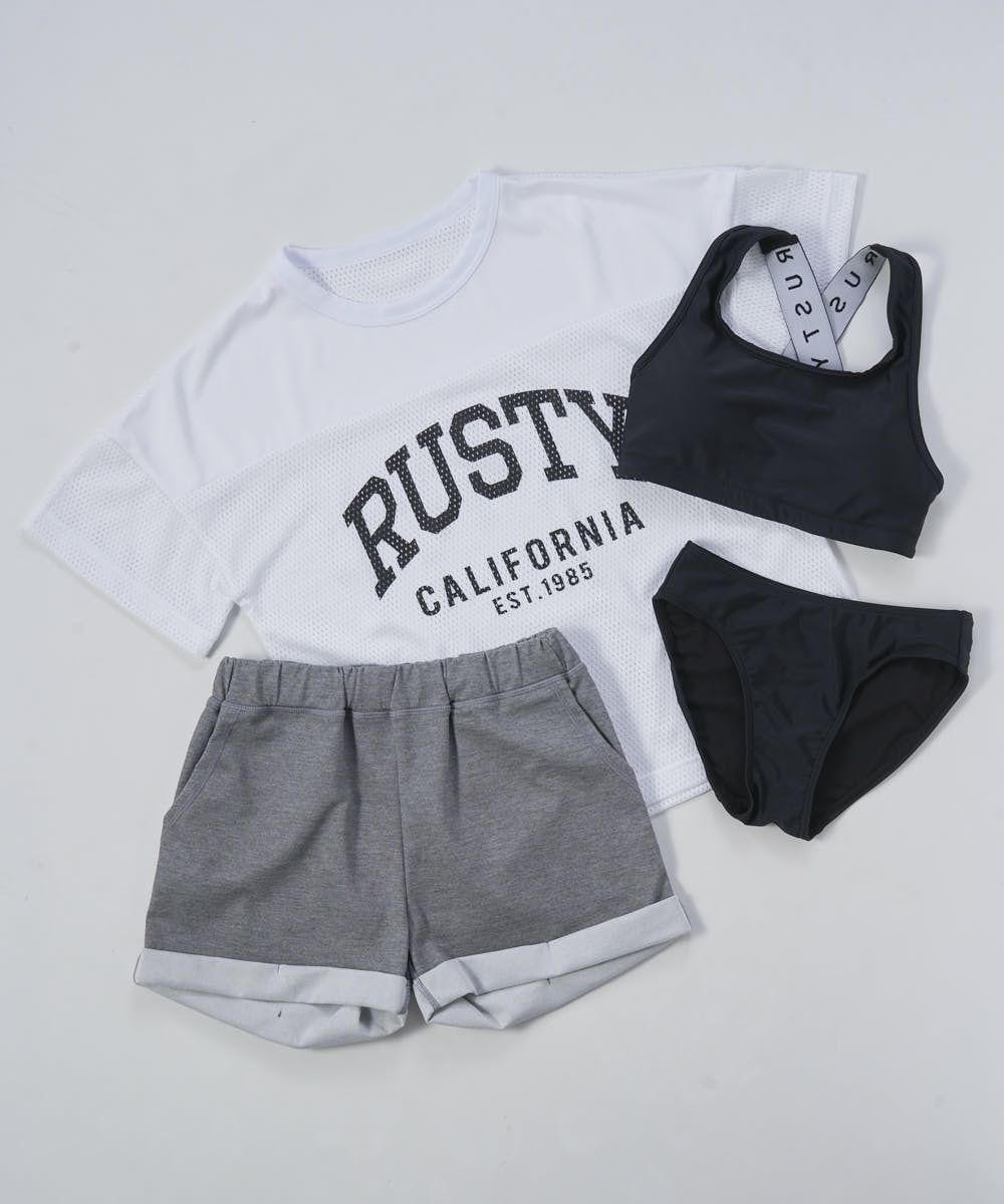 スポブラビキニ、UV メッシュTシャツ、裏毛ショーツ、水着4点セットでスポーティに、かっこよく 着こなせる。