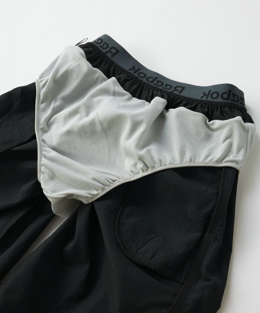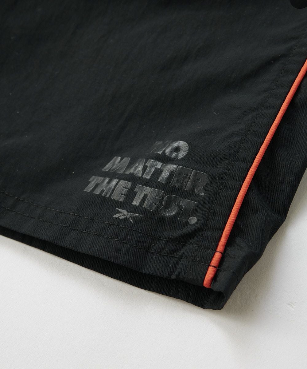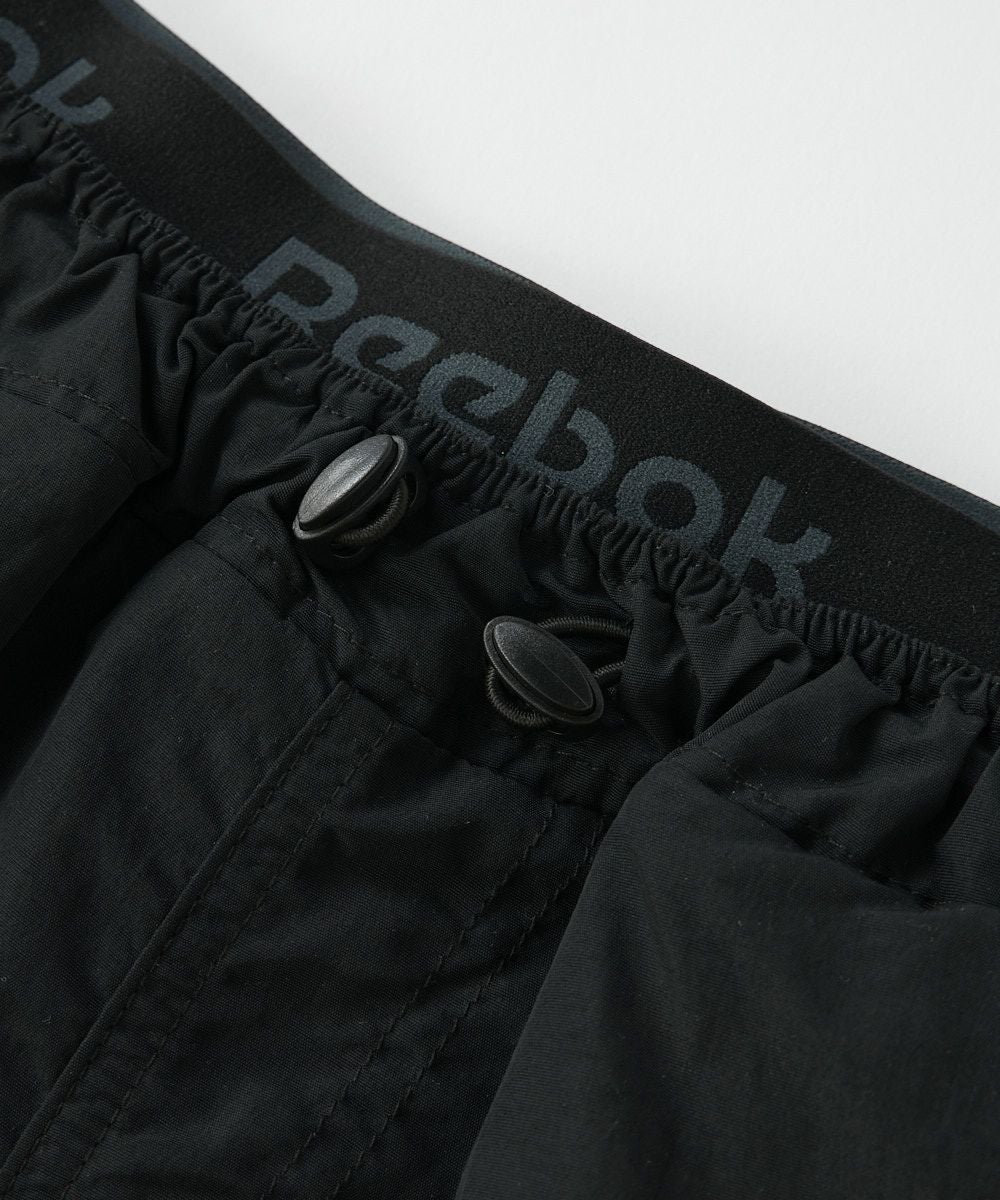 ウエスト部分にReebokのロゴテープが付いている重ね着風のデザインがポイント。コードゴムも付いてい るのでナイロン素材のスポーティーな雰囲気にぴったりです。