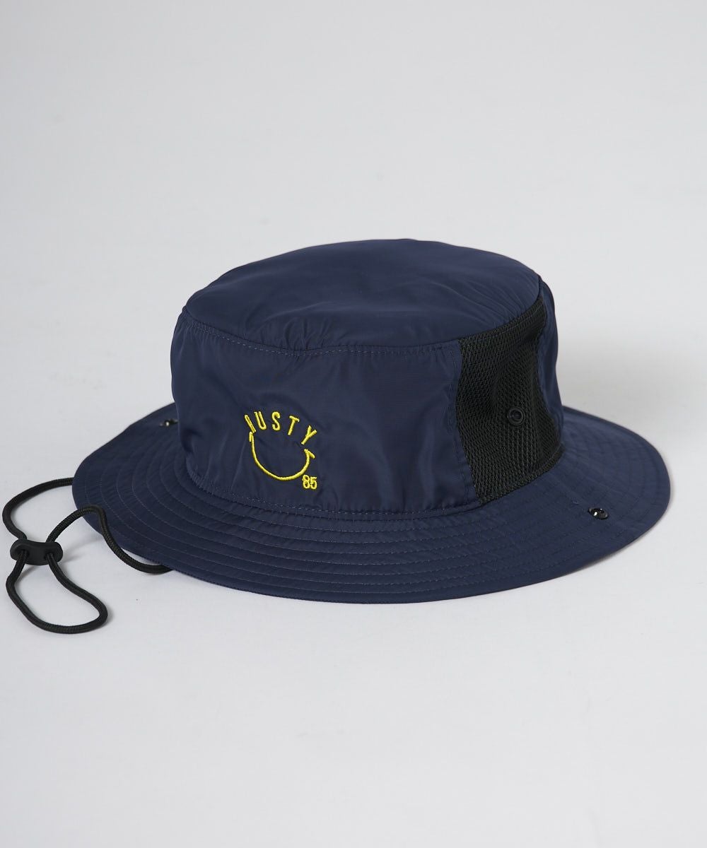 サイドはメッシュ切り替えで通気性バツグン!取り外し可能なあご紐付きで、風が強い日でもしっかりフィットします。フロントに刺繍された「RUSTY」のロゴとニコちゃんがさりげないアクセントに♪