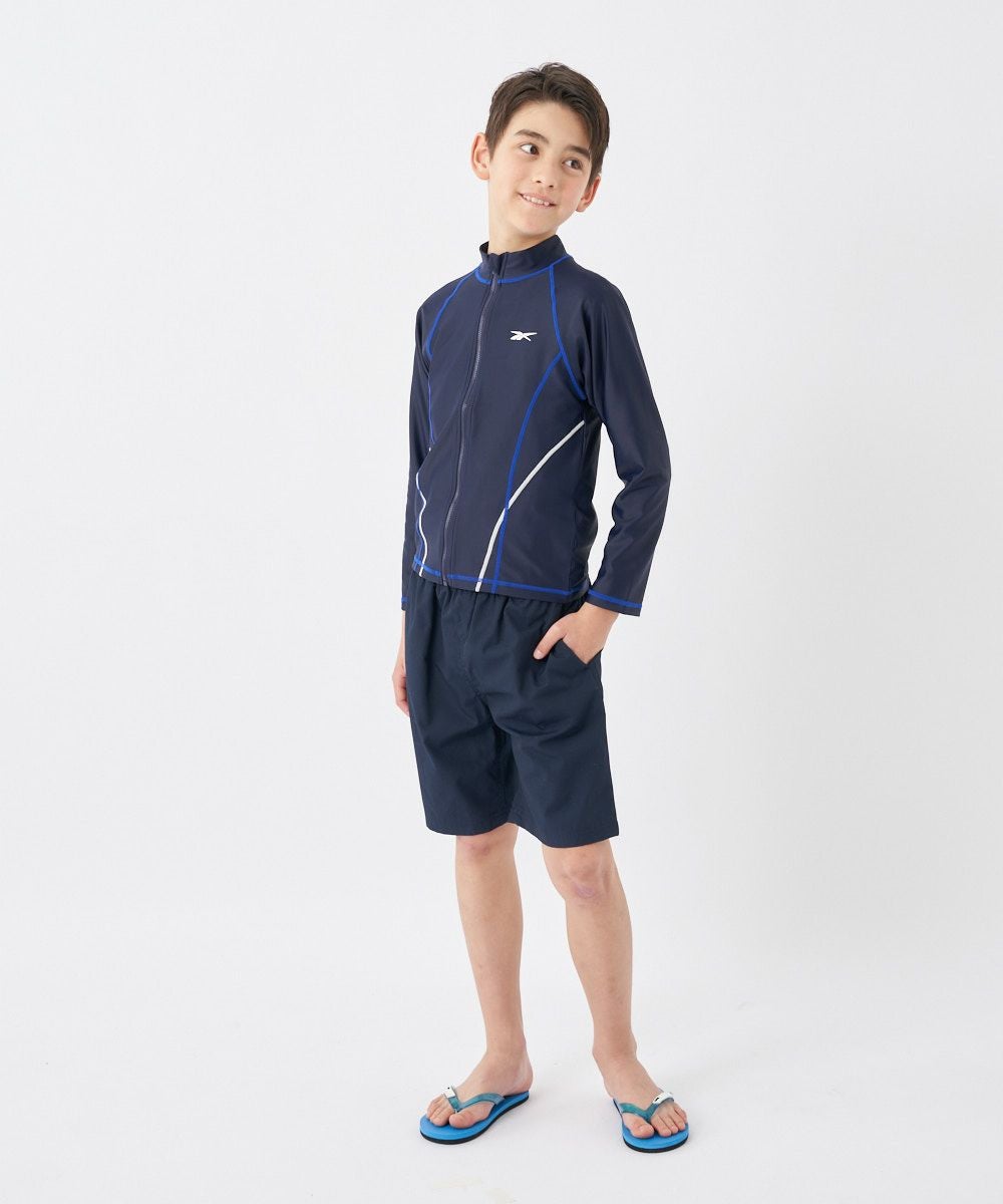 紫外線や擦り傷防止アイテムとして欠かせないラッシュガード。前あきファスナーで着脱しやすく、襟元はファ スナーガード付きで安心です。