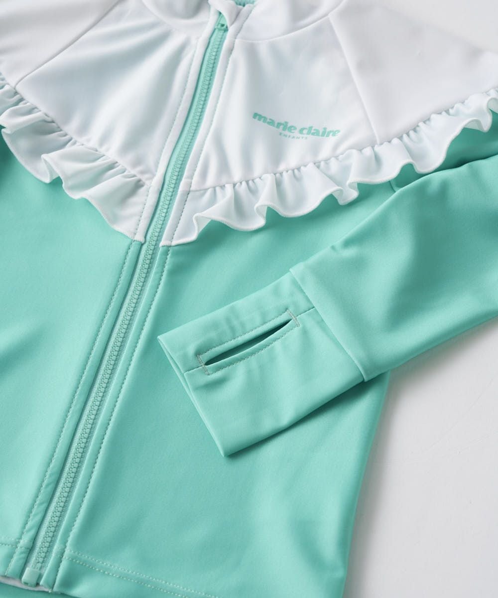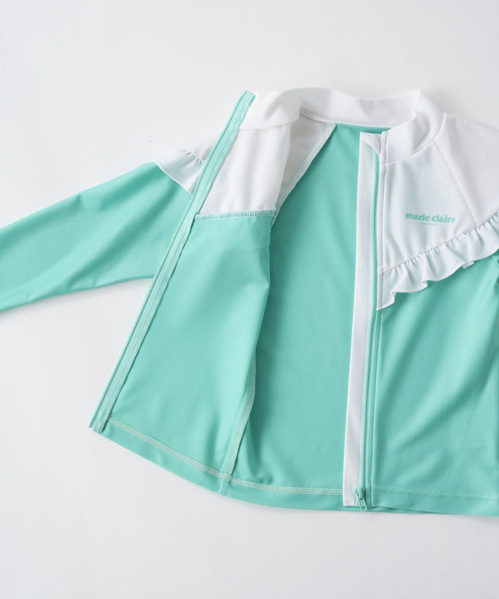 胸元にはフリルがデザインされたかわいいラッシュガード。