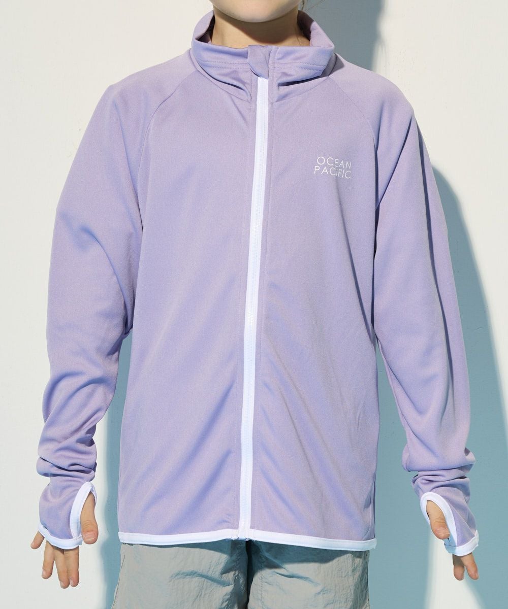 スタンドカラーと指穴仕様で、首や手の甲の日焼けもしっかりガードします。首元にファスナーが直接当たらないようにガードが付いているのもポイント。