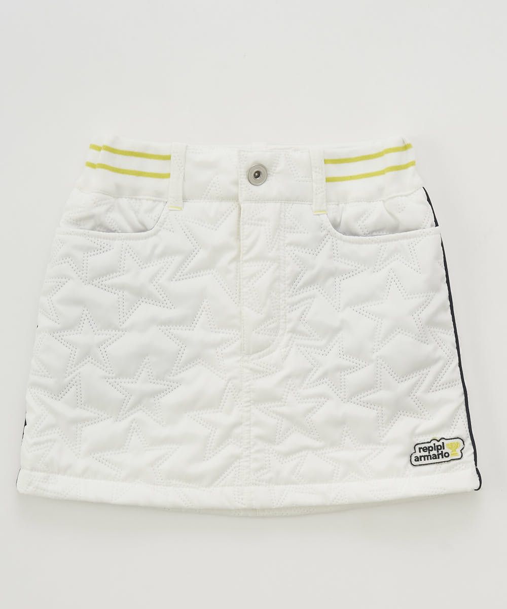 REPIPIの中綿キルトスカート。裏地は起毛トリコットで暖かく、ウエスト部分はゴム素材を使用し動きやすい一枚です。