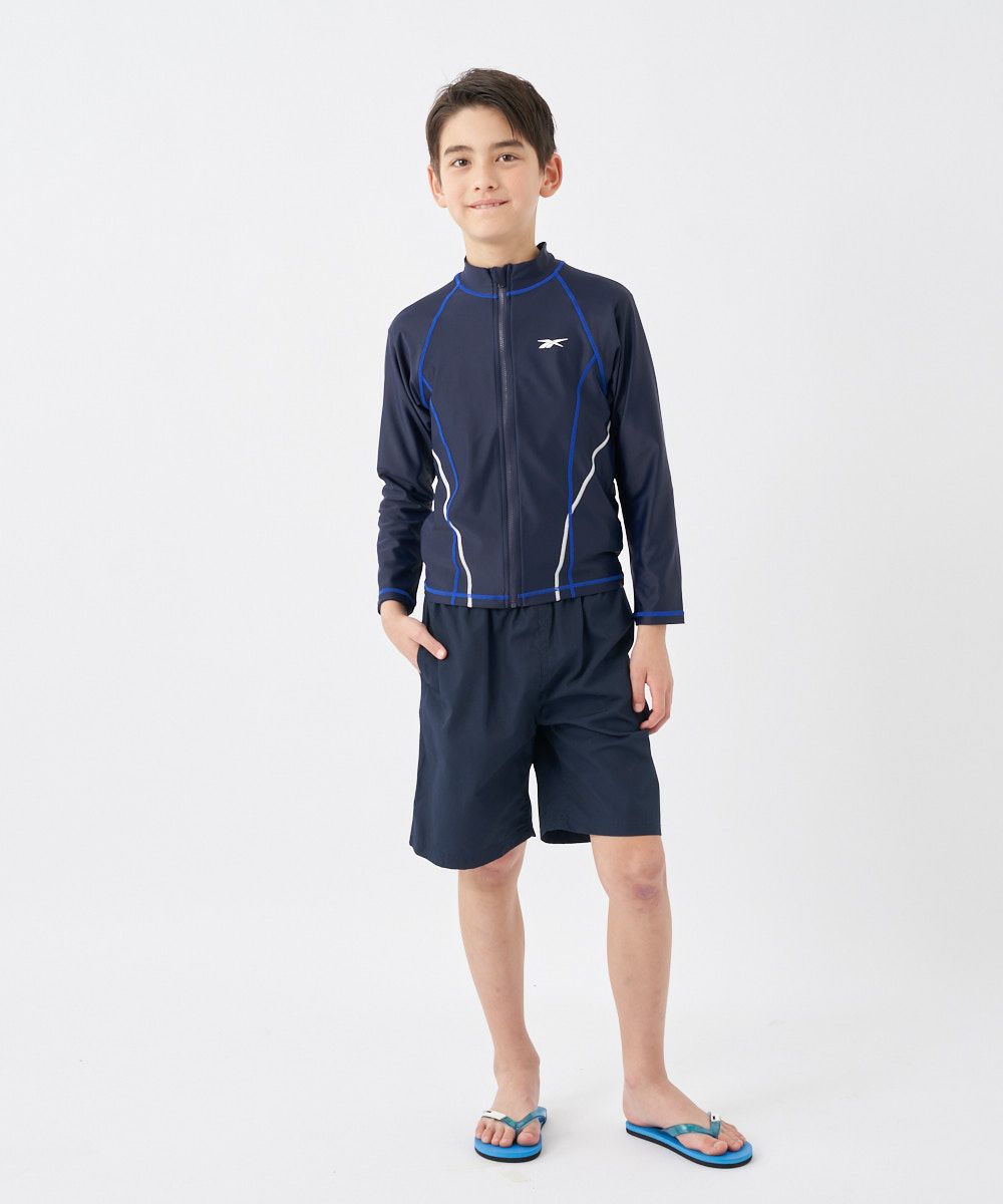 紫外線や擦り傷防止アイテムとして欠かせないラッシュガード。前あきファスナーで着脱しやすく、襟元はファ スナーガード付きで安心です。