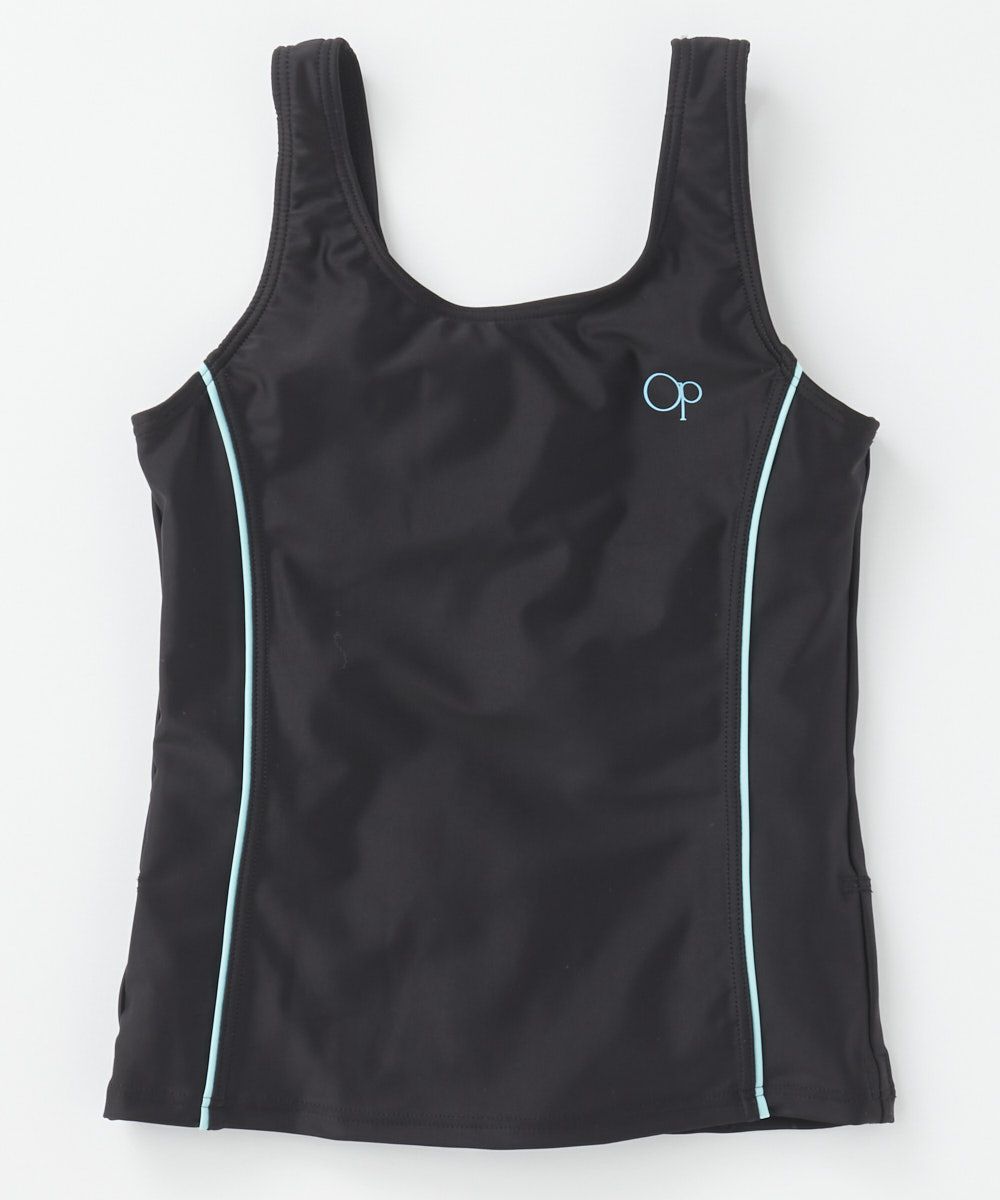 動きやすく、着替えやすいタンキニタイプ! 肌見せ部分が少ないので、いっぱい泳ぎたくて、体型が気になる女の子にオススメのデザインです♪