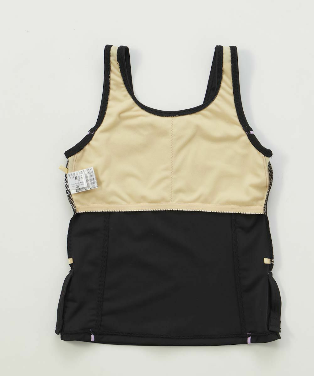 動きやすく、着替えやすいタンキニタイプ! 肌見せ部分が少ないので、いっぱい泳ぎたくて、体型が気になる女の子にオススメのデザインです♪