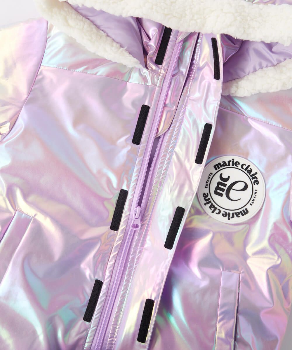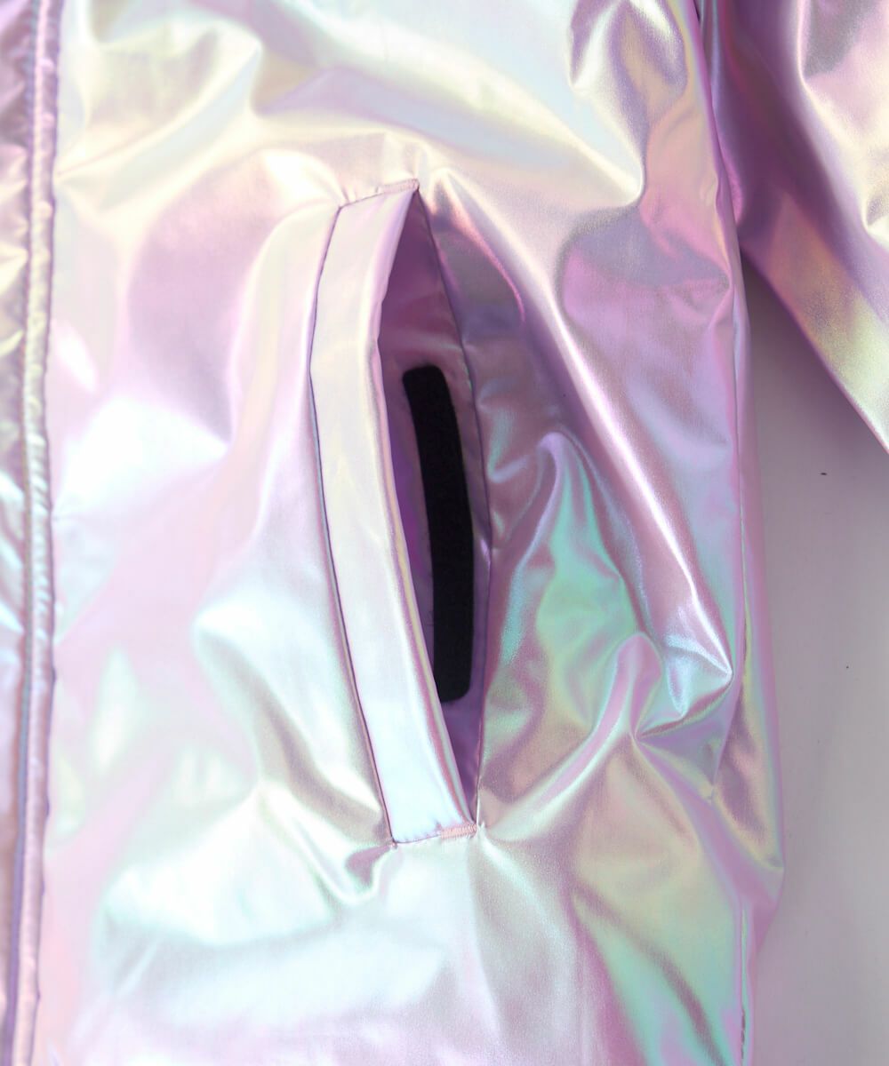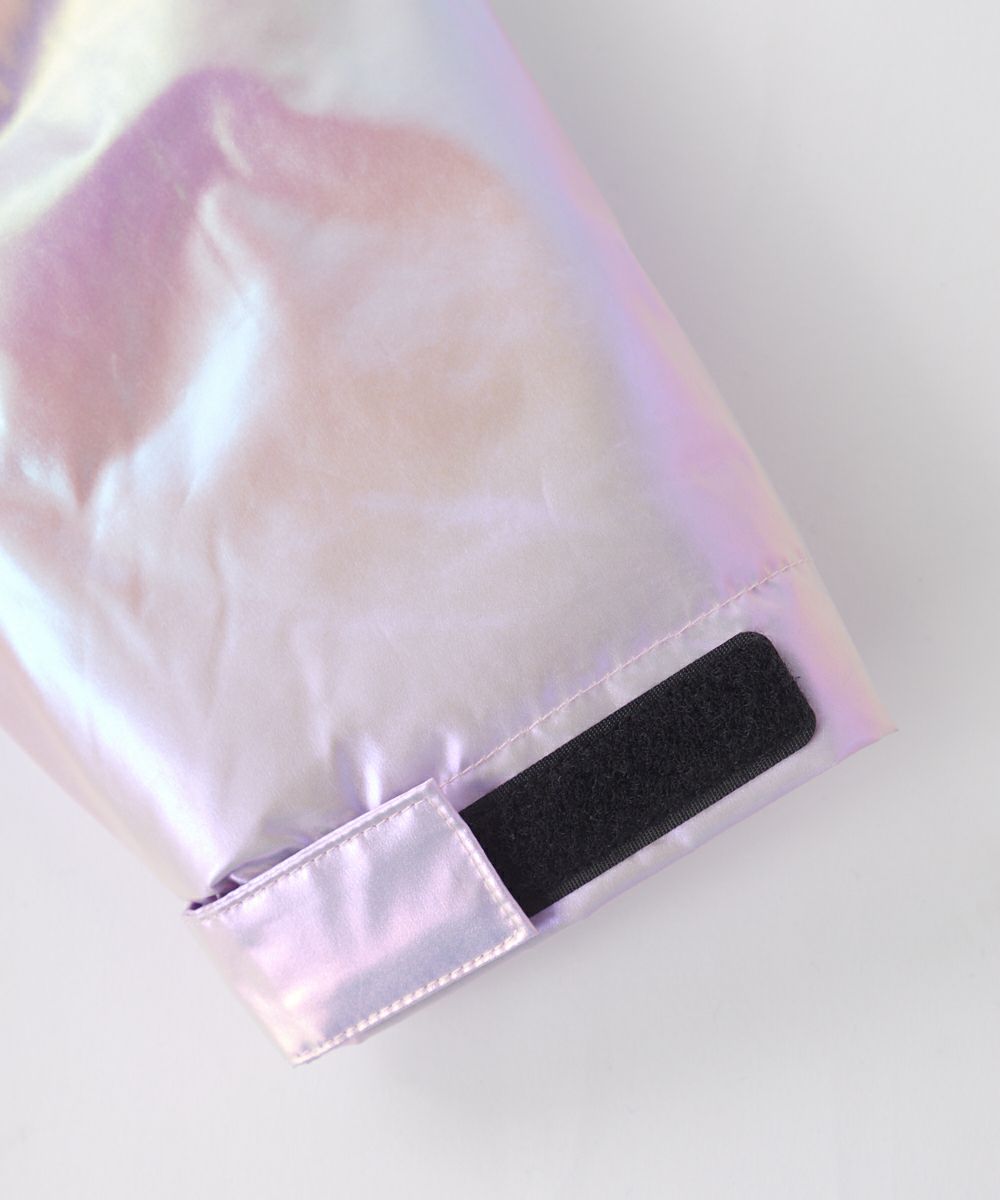 光の加減で色合いが変わるオーロラカラーが目を引くスノーウェア。