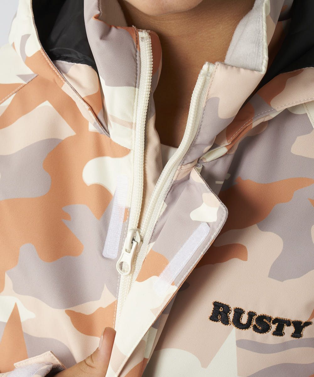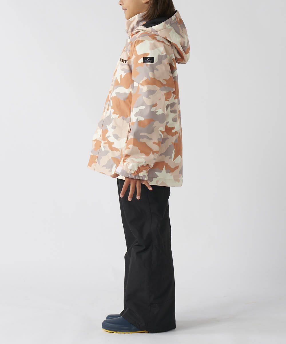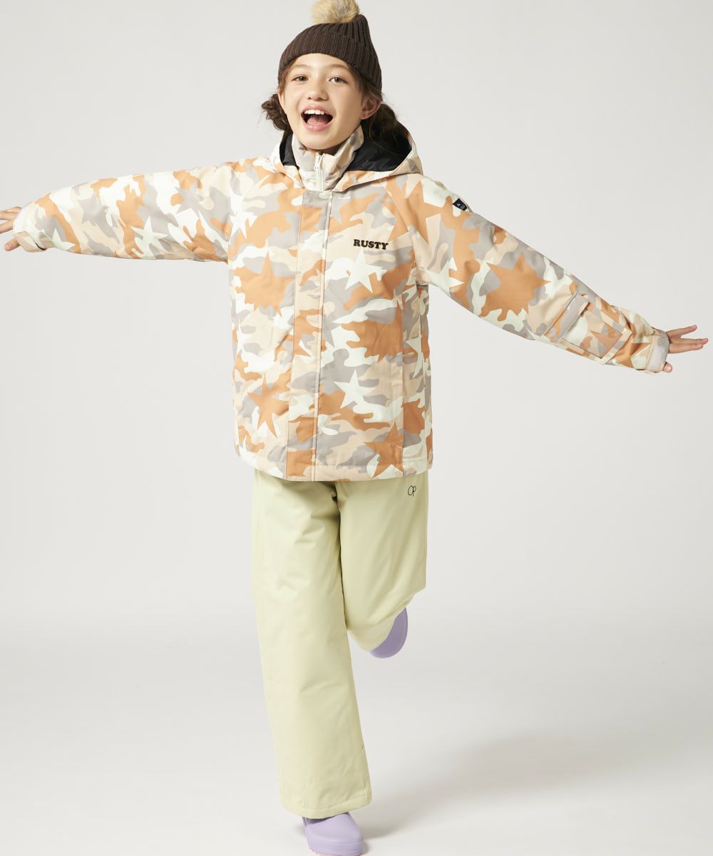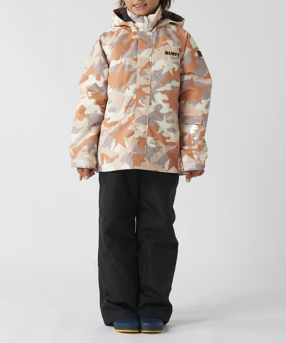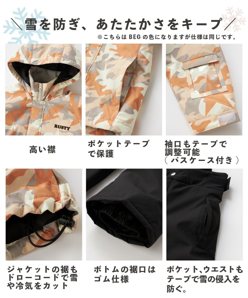 ジャケット&パンツのスキー・スノーボードウェア上下セットです。スノボーやスキー、雪遊びなどウインタースポーツで大活躍!ゲレンデで目を惹く、迷彩デザインです。サスペンダーで調整可能なので、成長に合わせて長く着られます。左袖には便利なパスケース付き。お子様が安心して着用できる、ママもうれしい機能付き!