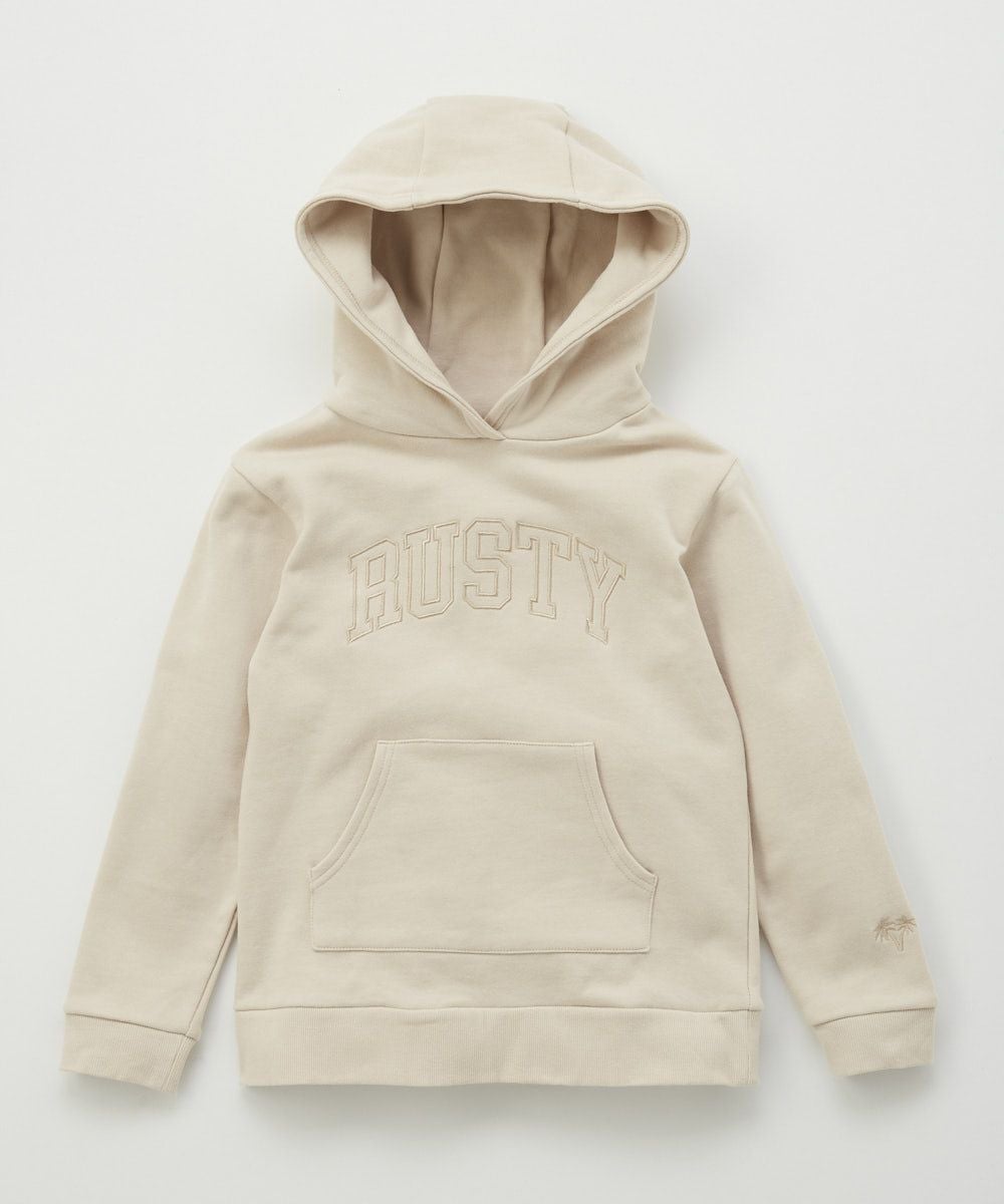 トレンド感のあるカレッジロゴを生かした刺繍デザインパーカー。袖口にはRUSTYらしいヤシの 木ワンポイント刺繍。少しヴィンテージ感のあるような色合いや刺繍デザインがポイントです。