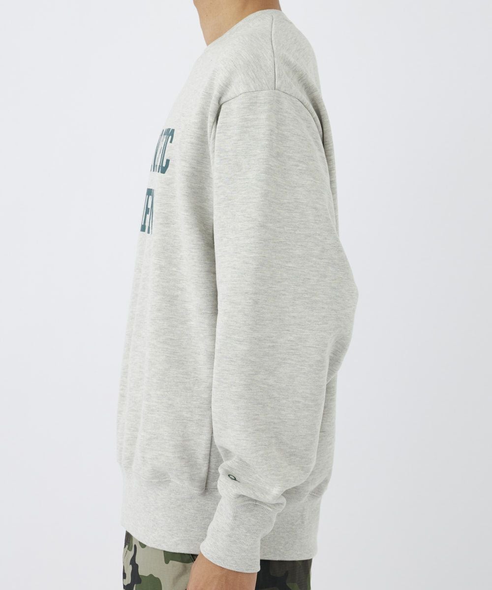 裏起毛の暖かクルースウェットにカレッジ調のロゴをプリントした流行のデザイン。