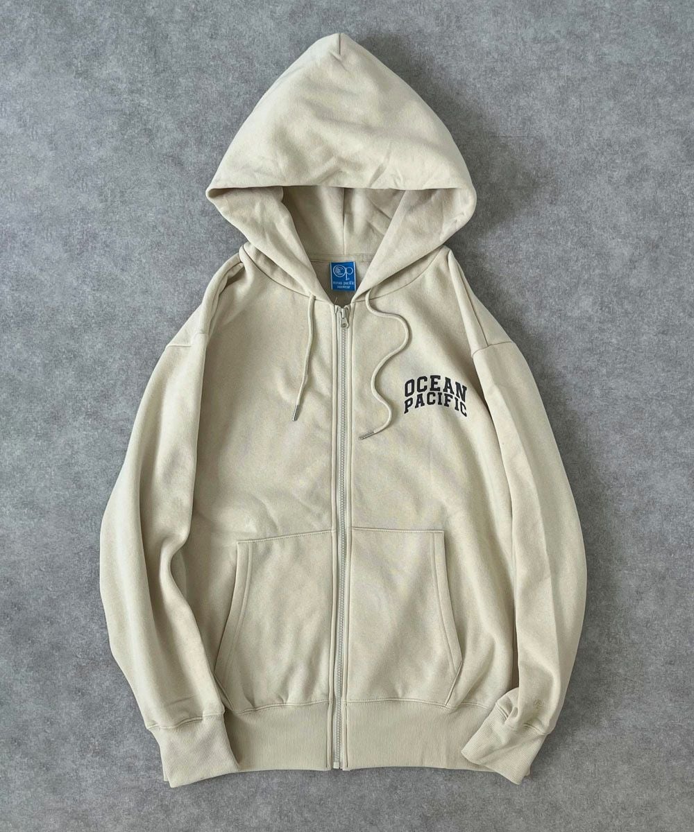 シンプルなデザインの裏起毛ジップパーカー。胸にはocean pacificのワンポイントロゴが魅力。