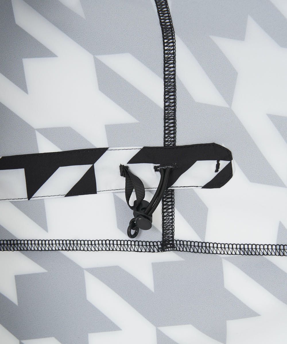 あらゆる動作を快適にする特殊な縫製パターンを採用。4WAYストレッチ生地と相まって着用時のストレスを感じさせません。各所に備え付けられたドローコードを調整することで雨や風の侵入を防ぎ、ウエアのバタつきも軽減します。さらに撥水加工を施すことでアウトドアシーンにおける理想のメンズウェアが完成しました。