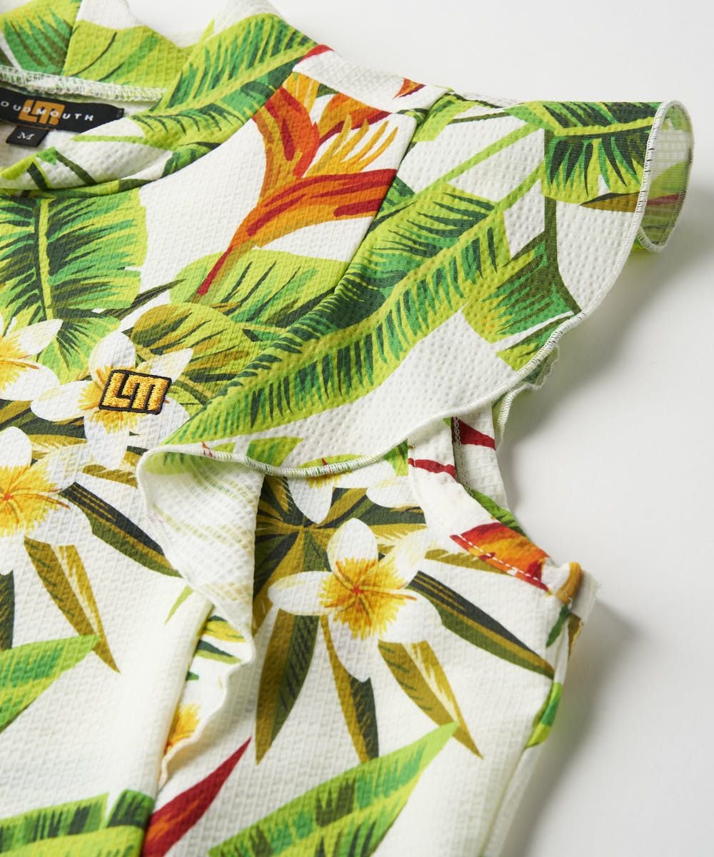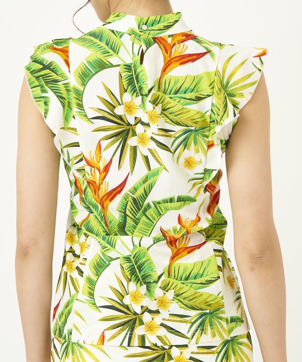 サラッとした肌触りのストレッチサッカー素材を使用した女性らしいフリルデザインモックネックシャツ。シーズントレンドのリゾート柄展開で上下コーディネートできるアイテムとなっております。