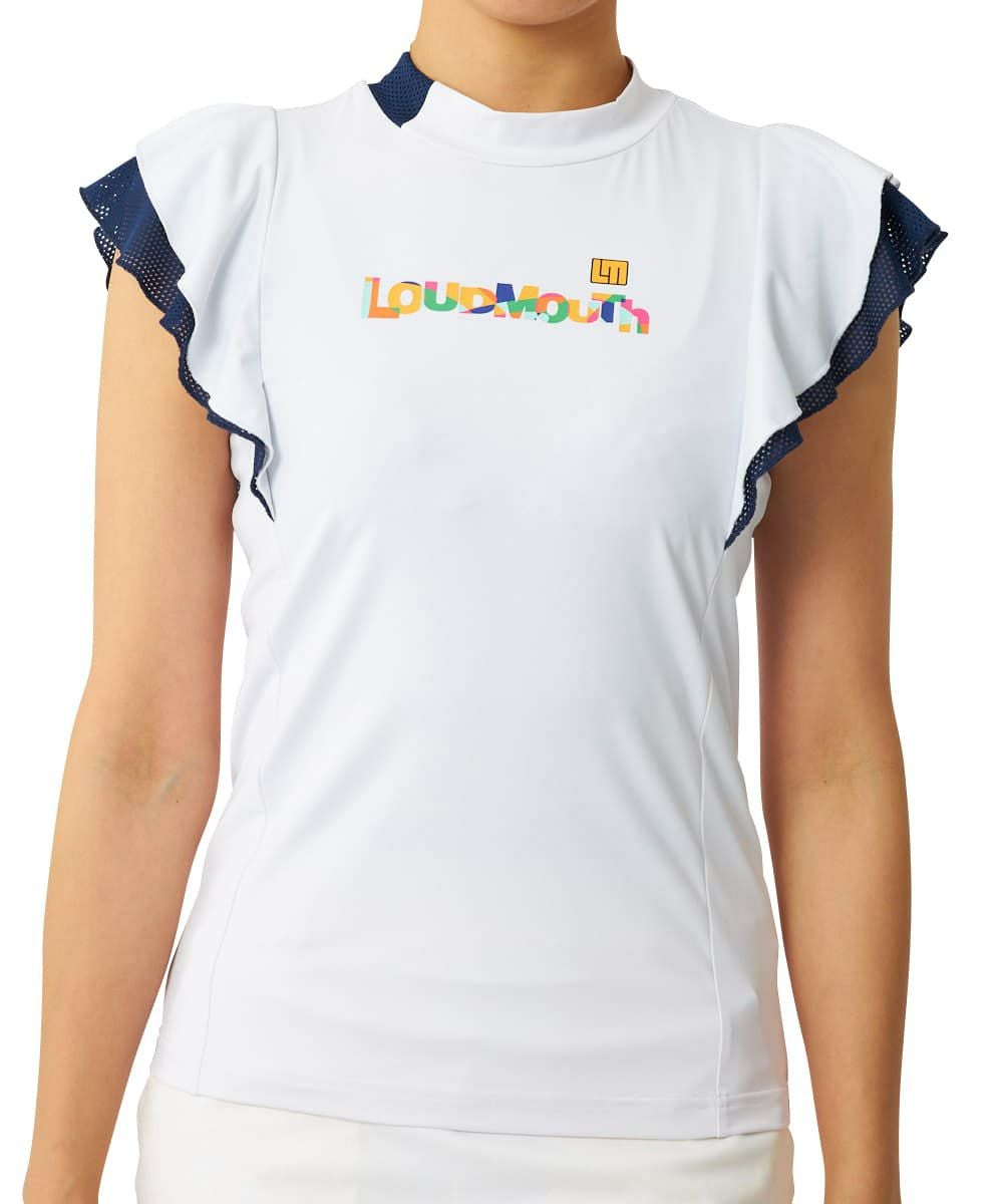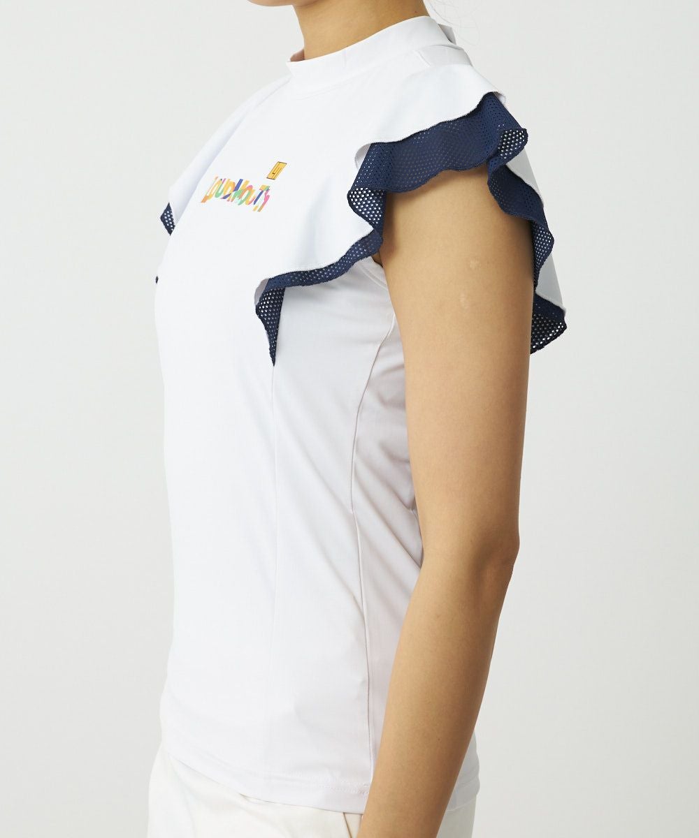 ECO防透スムース素材のモックネックノースリーブフリルシャツ。GOLFらしいモックネックに女性らしいフリルデザインがポイントです。無地でコーディネートしやすいアイテムです。