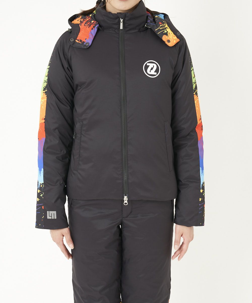 ラウドマウスらしいフード裏と袖にプリントパーツをあしらったデザインアクセントのダウンジャケット。