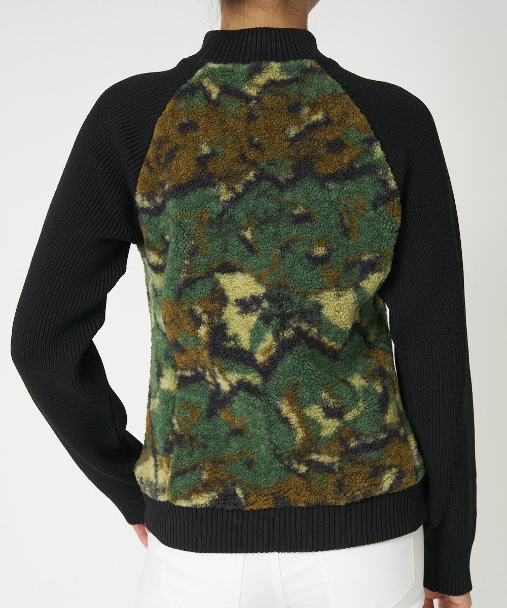前後身頃はオリジナル柄のストレッチボアフリース素材を使用し、袖はニットの異素材デザインプルオーバーです。 身頃は暖かく、袖はニットで動きやすく、一枚でしっかり防寒できるアイテムです。