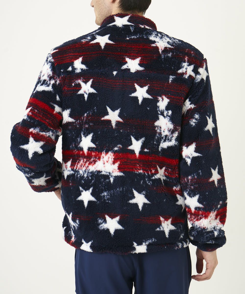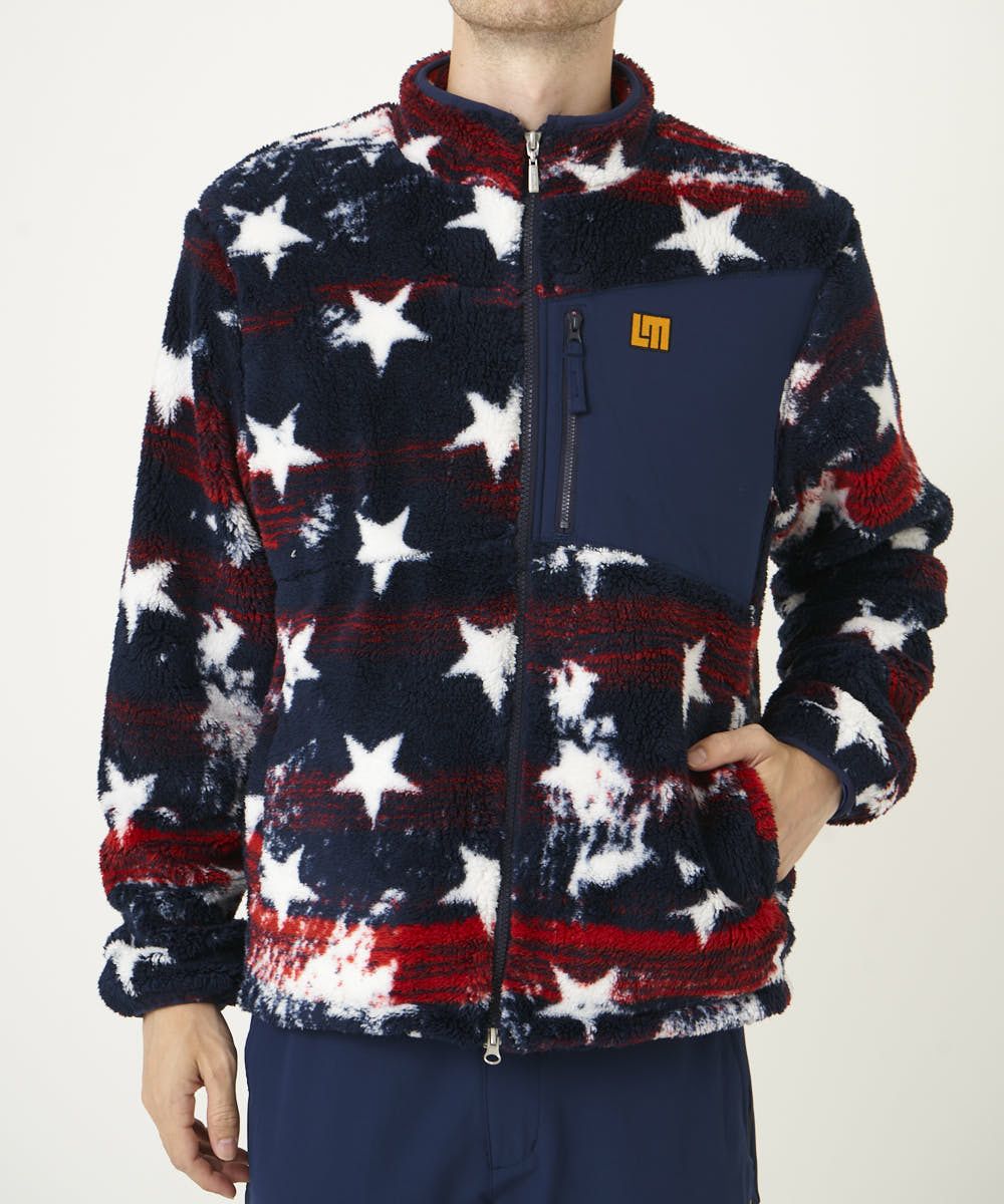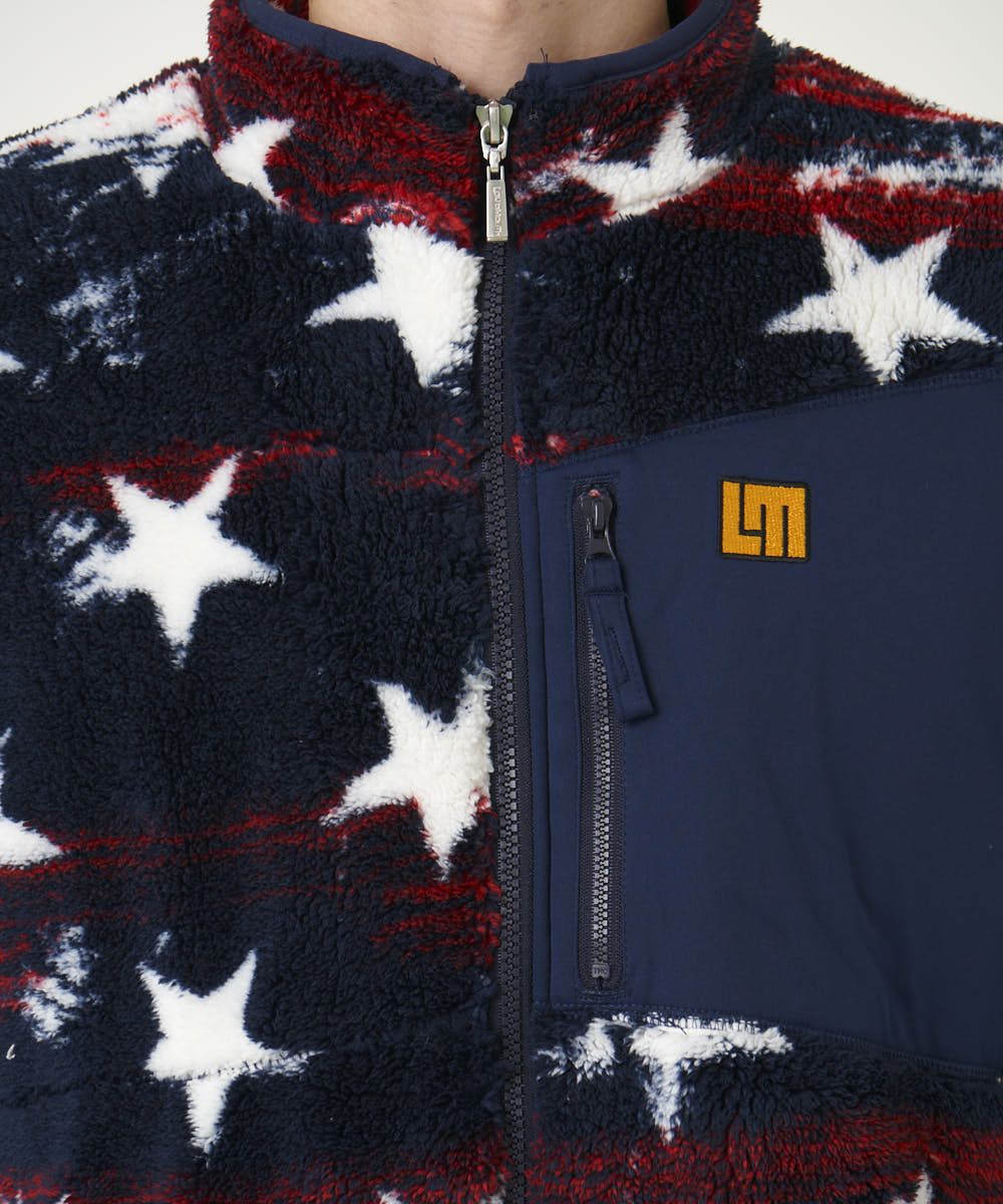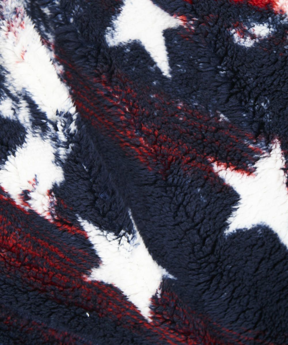 人気のあるStar 柄プリントのボアフリースジャケット。ボアフリース素材と裏地には発熱シルバーフィルムを使用しているので保温性抜群です。マスクや小物を収納できる胸ポケット仕様。