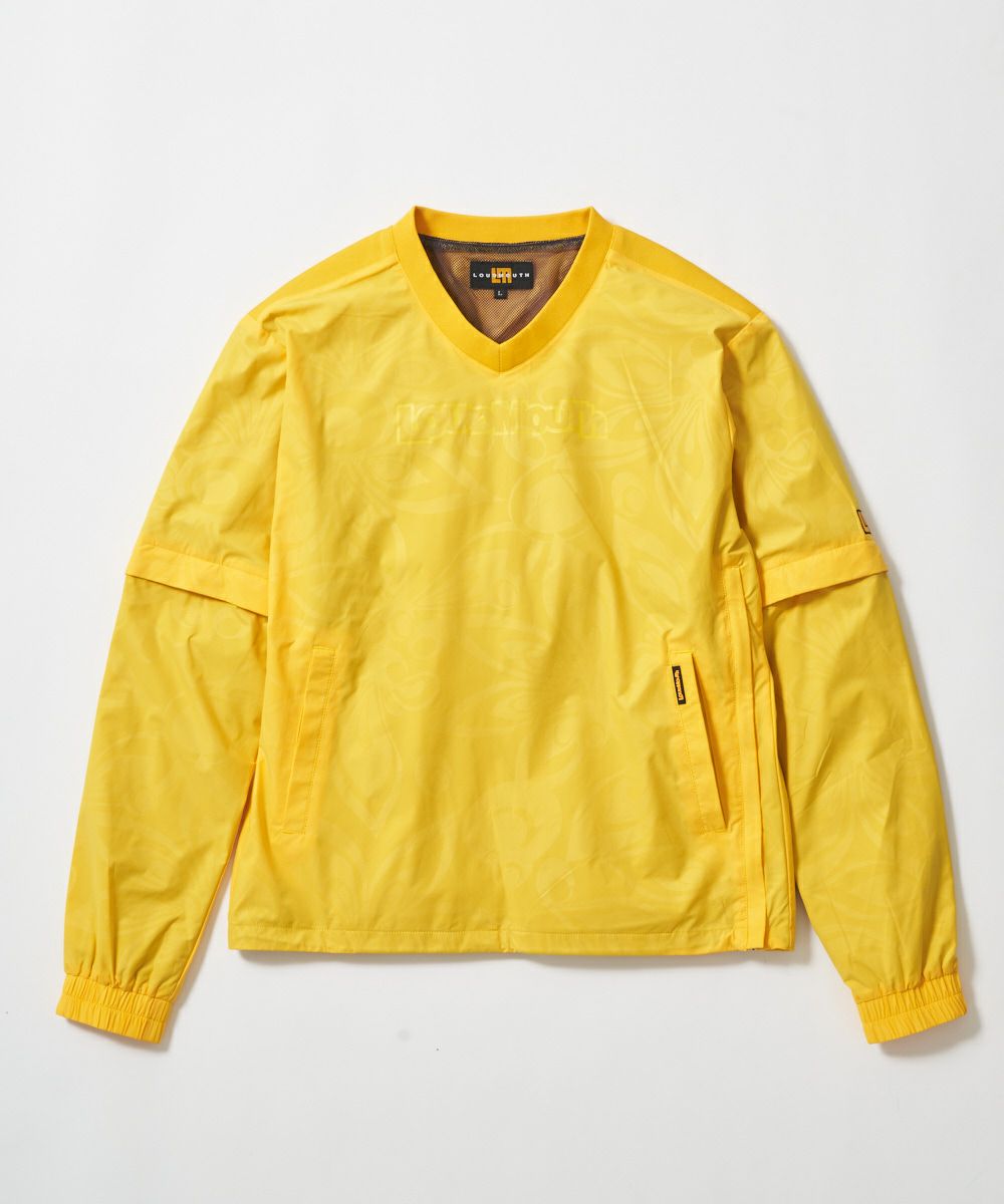 LOUDMOUTHらしいシャガデリックのトーンオントーン柄のストレッチタフタのプルオーバー。衿のリブを肩まで入れることで着脱しやすく、オールシーズンで使える仕様で一枚あるとコーディネートしやすいアイテムです。