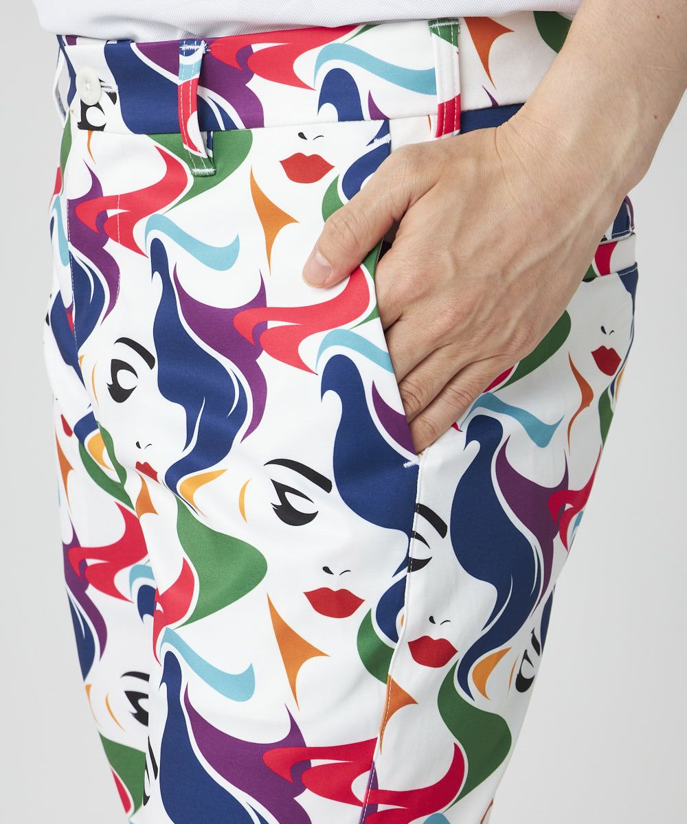動きやすいポリエステルツイル素材を使用した柄パンツ。