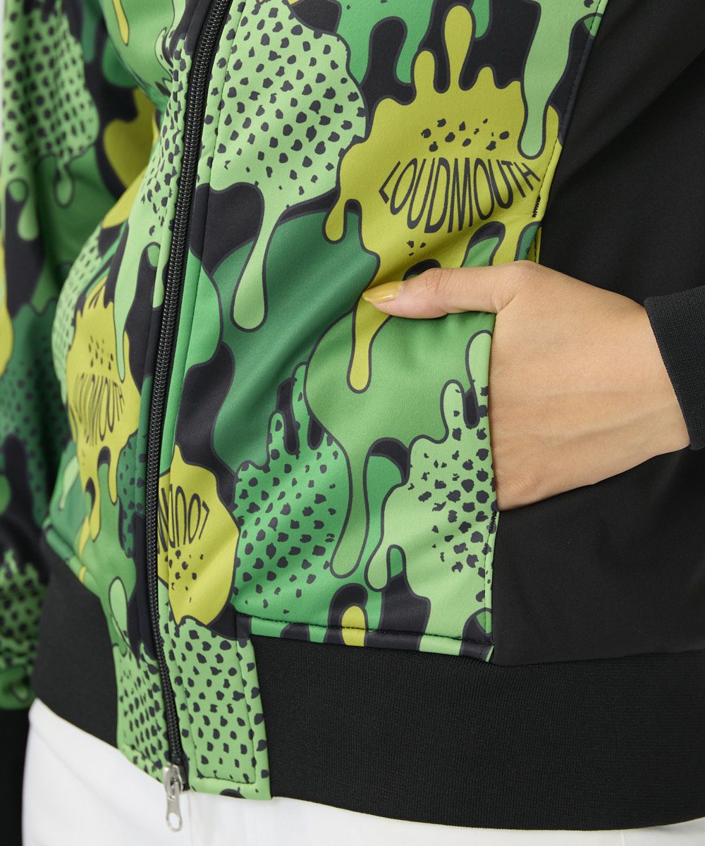 ストレッチ性のあるカットソー素材と裏フリース素材にフィルム加工を施し3層ボンディング素材を使用したブルゾンです。 袖口と裾は風が入りにくいリブ使用で今シーズンインパクトのある柄の3カラー展開