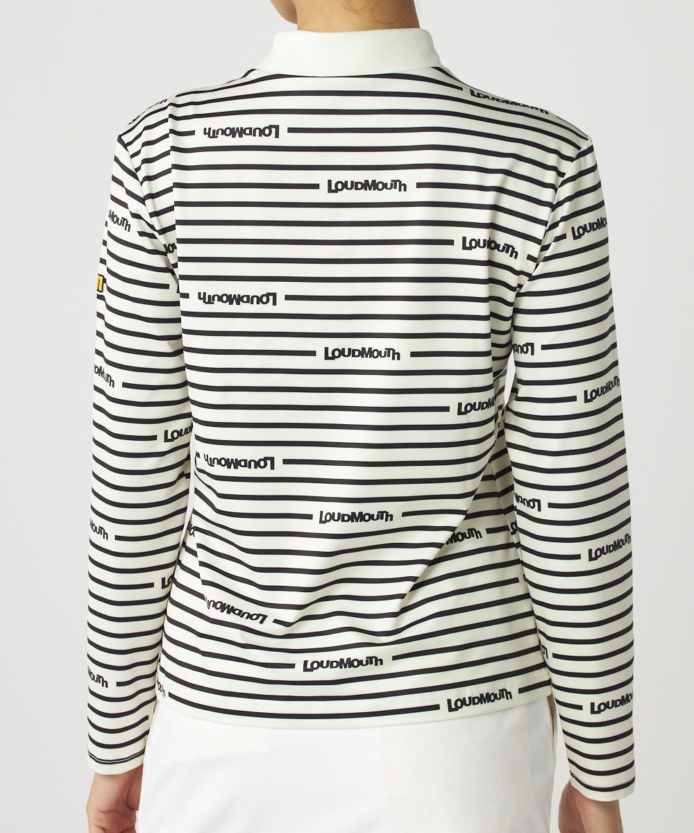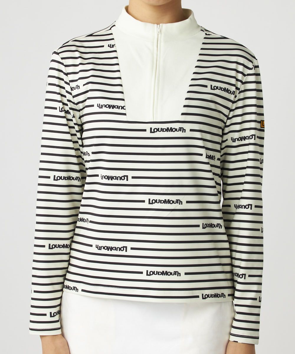 ECO裏起毛ベア天竺素材のボーダーとロゴプリントデザインのモックネックハーフジップシャツ。