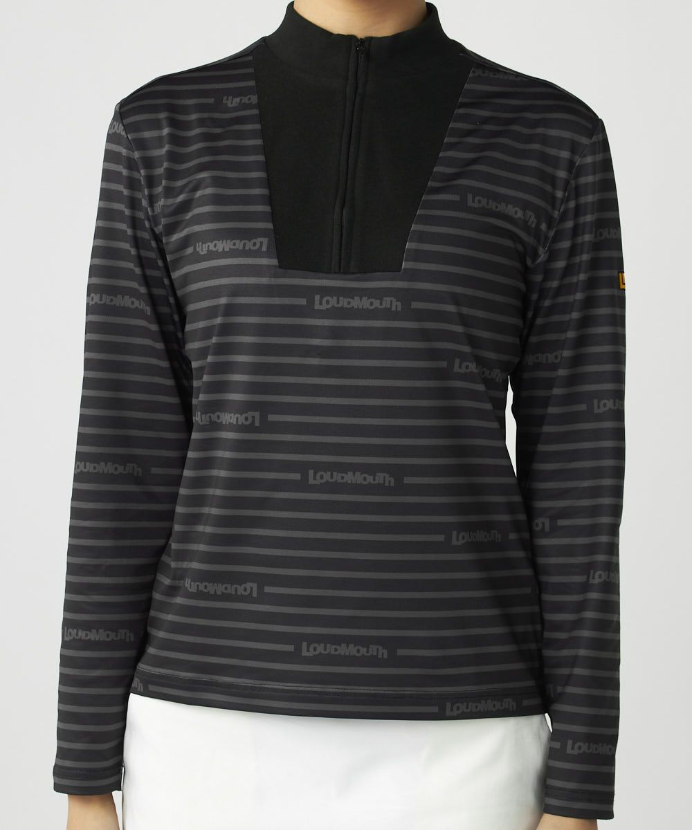 ECO裏起毛ベア天竺素材のボーダーとロゴプリントデザインのモックネックハーフジップシャツ。