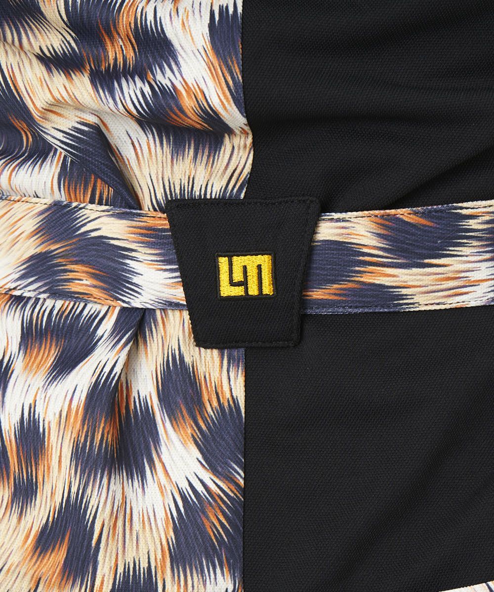 サラッとした肌触りの ポリエステル素材を使用した柄ワンピース。たて切替柄の2ブロックワンピース。今シーズンのインパクトのある柄を展開。
