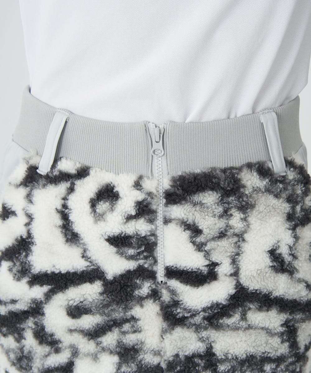 前身はオリジナル柄のストレッチボアフリース素材、後身は圧着加工裏地蓄熱フィルム中綿のLMロゴキルト素材となっています。 見る方向によって変化を楽しめるデザインスカート。
