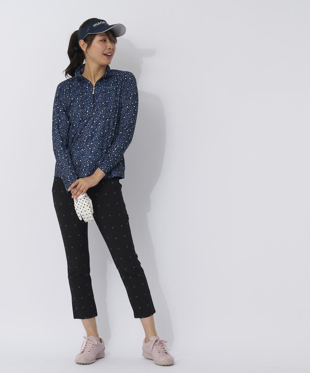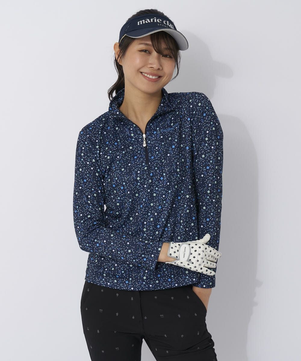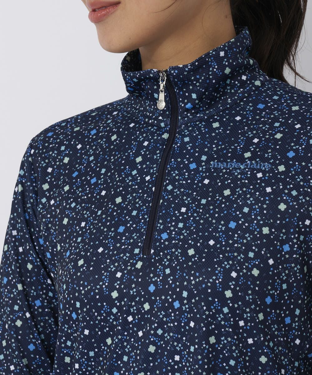 やっぱり快適さ№1のZIPUPシャツで快適プレーを♪袖下、脇に同柄のメッシュ素材を切り替え、快適さを兼ね備えています。薄くてサラっとしたポリエステル素材で高機能な素材です。スプレーしたような爽やかなお花柄がカワイイ一枚です。