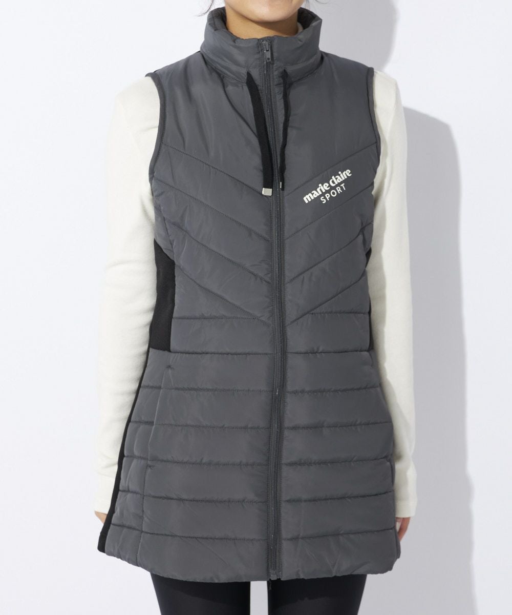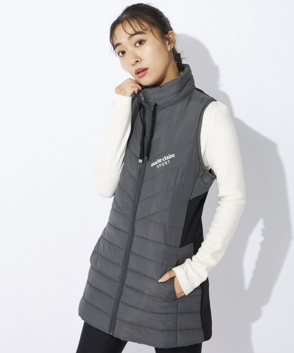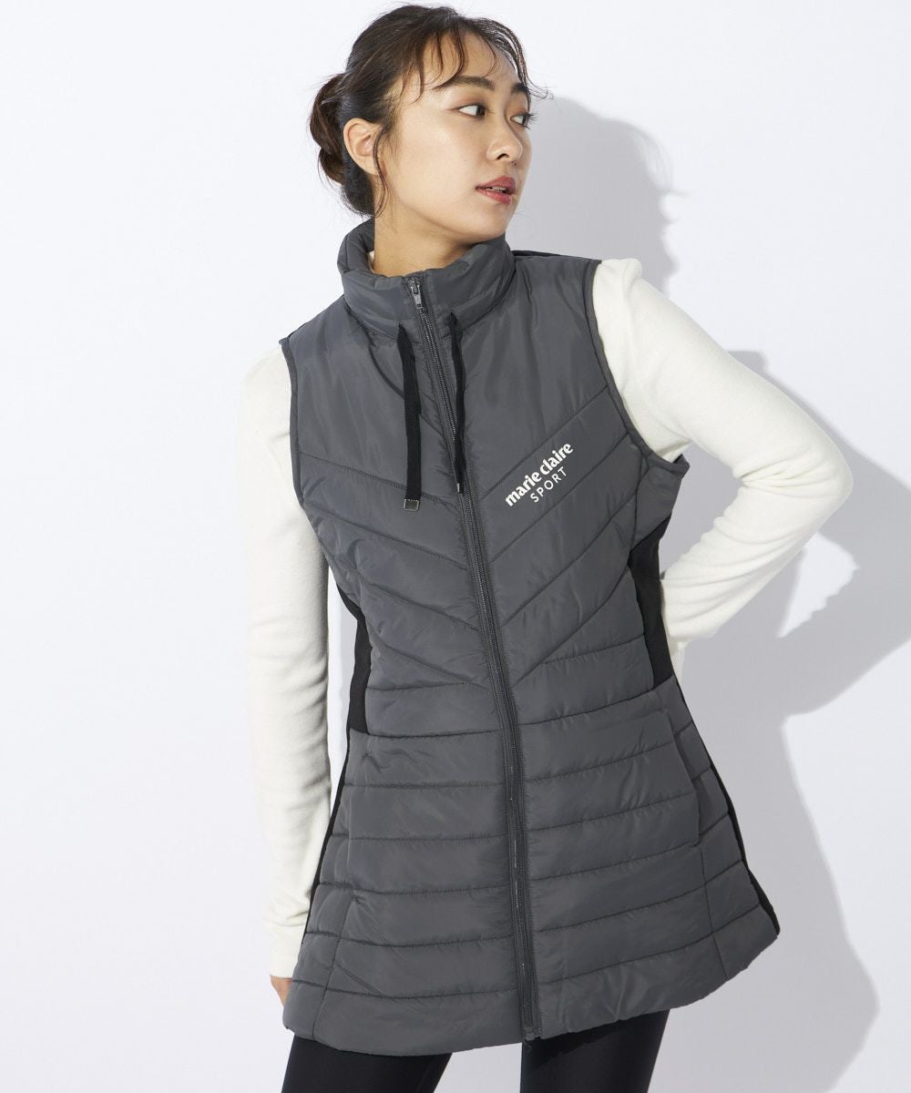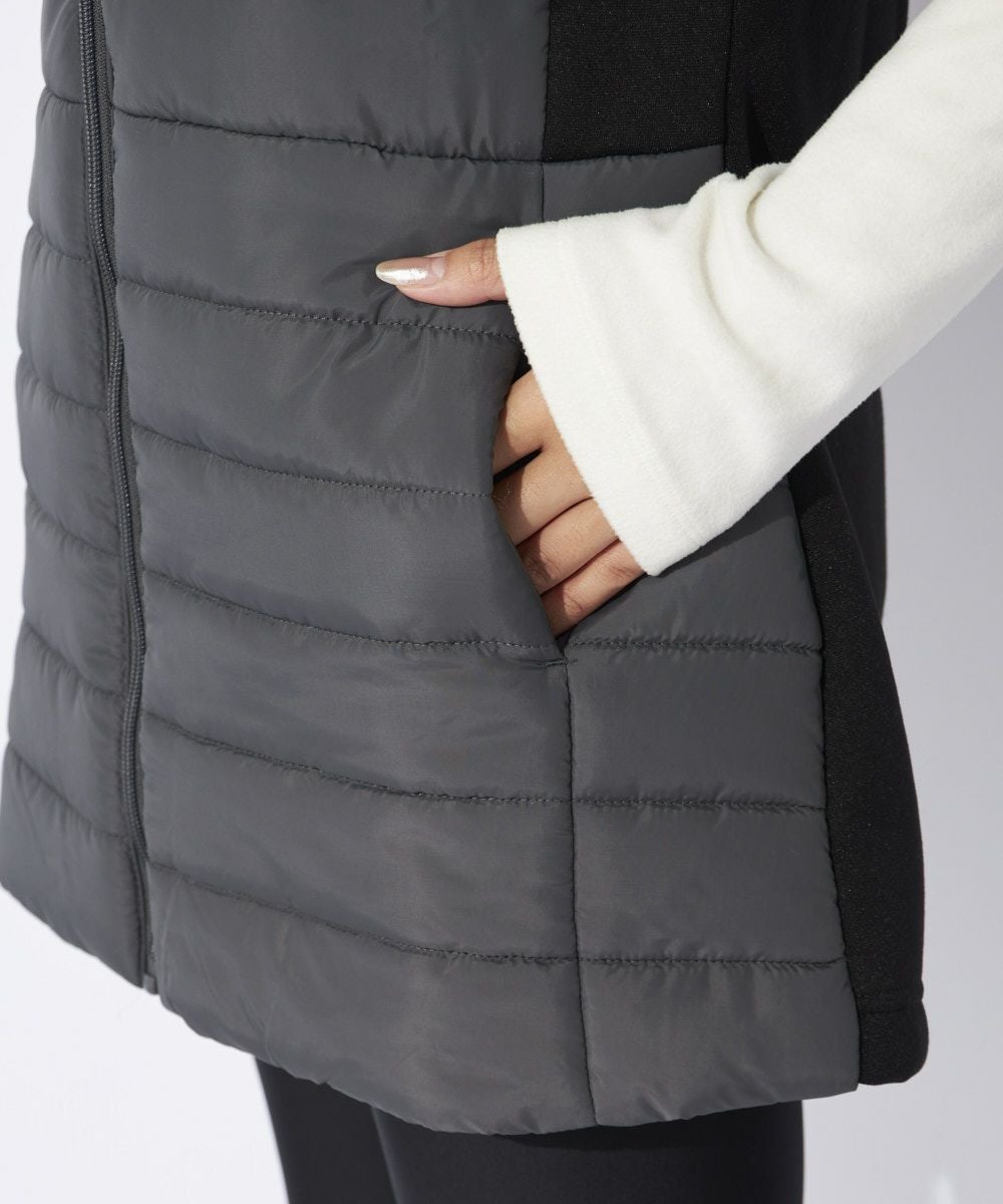 少し高めのウエスト切り替えで、脚長効果が期待できます!スウェットの裏起毛素材と中綿の組み合わせなので、さっと羽織れて暖かく、動きやすいのでワンマイルにぴったり。お尻までしっかりカバーできる使いやすいロング丈のベストです。