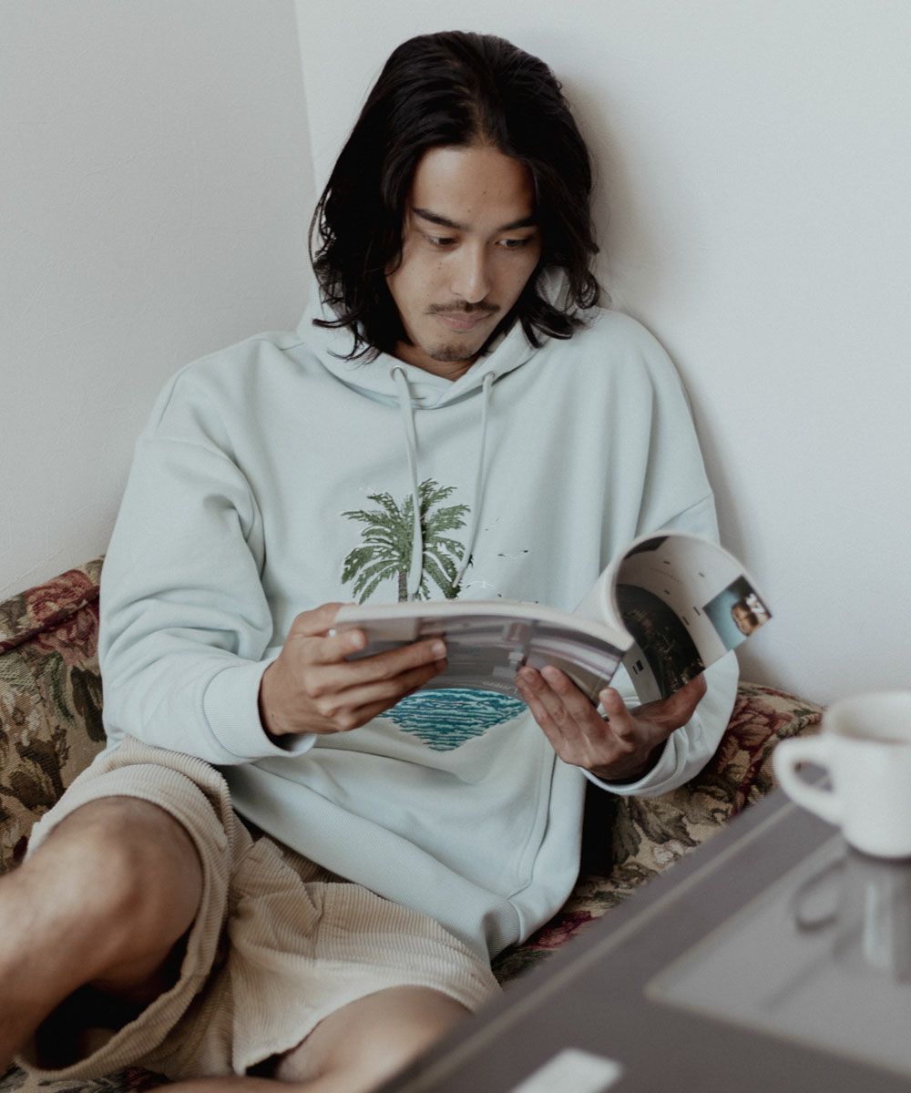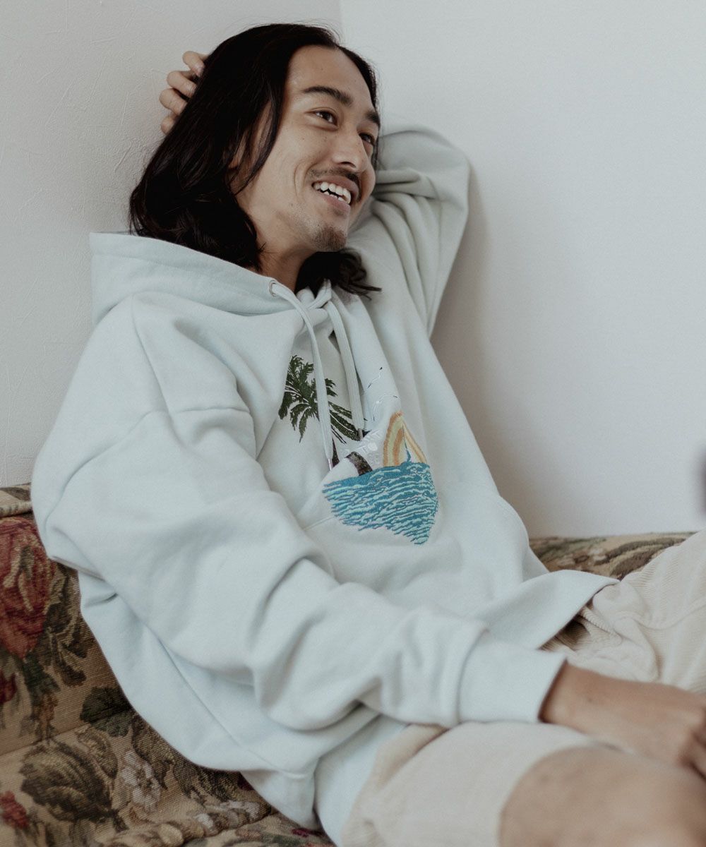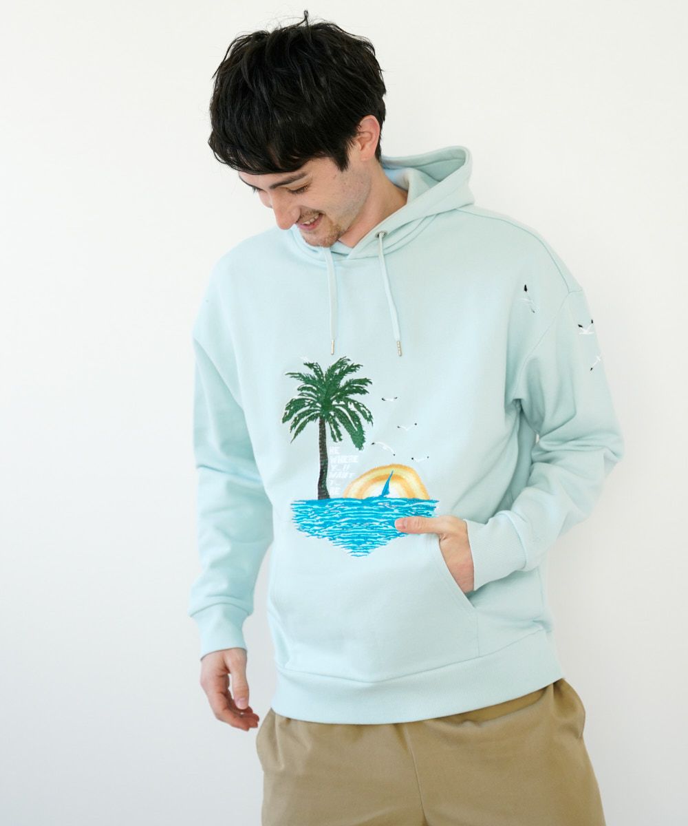 ポケット部分まで刺繍がつながっているのがポイント。 肩の位置のカモメ刺繍もボディと袖までまたがったこだわりパーカー