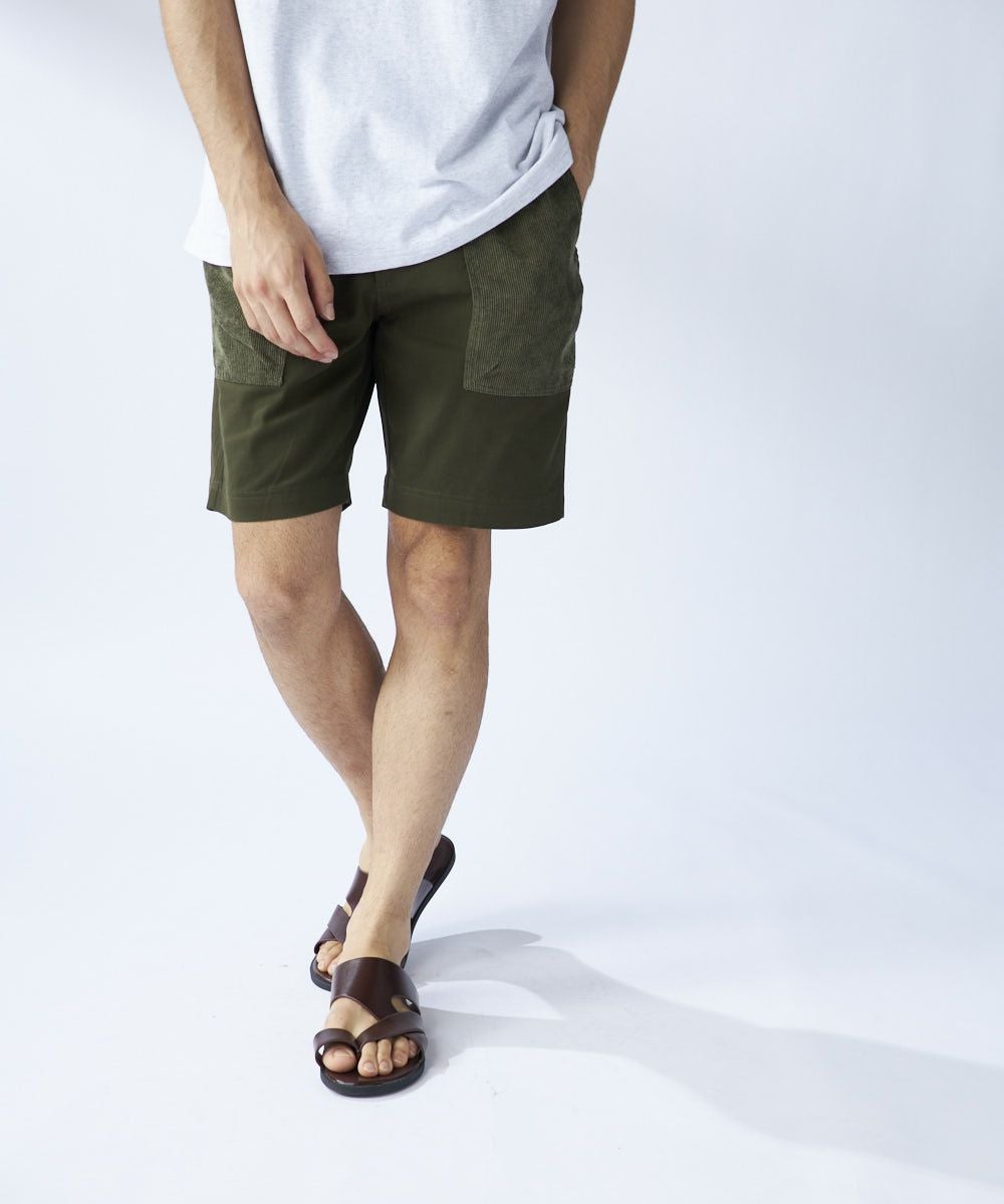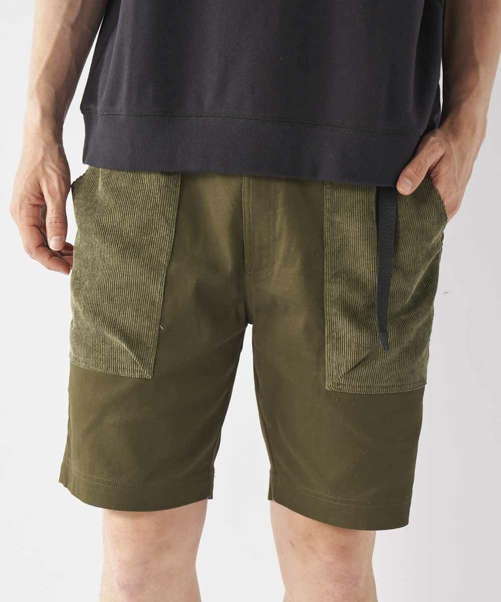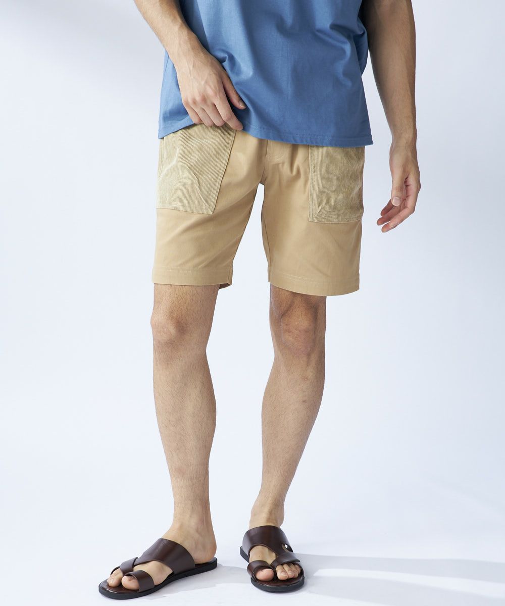 膝上丈の異素材ミックスデザインショートパンツ。