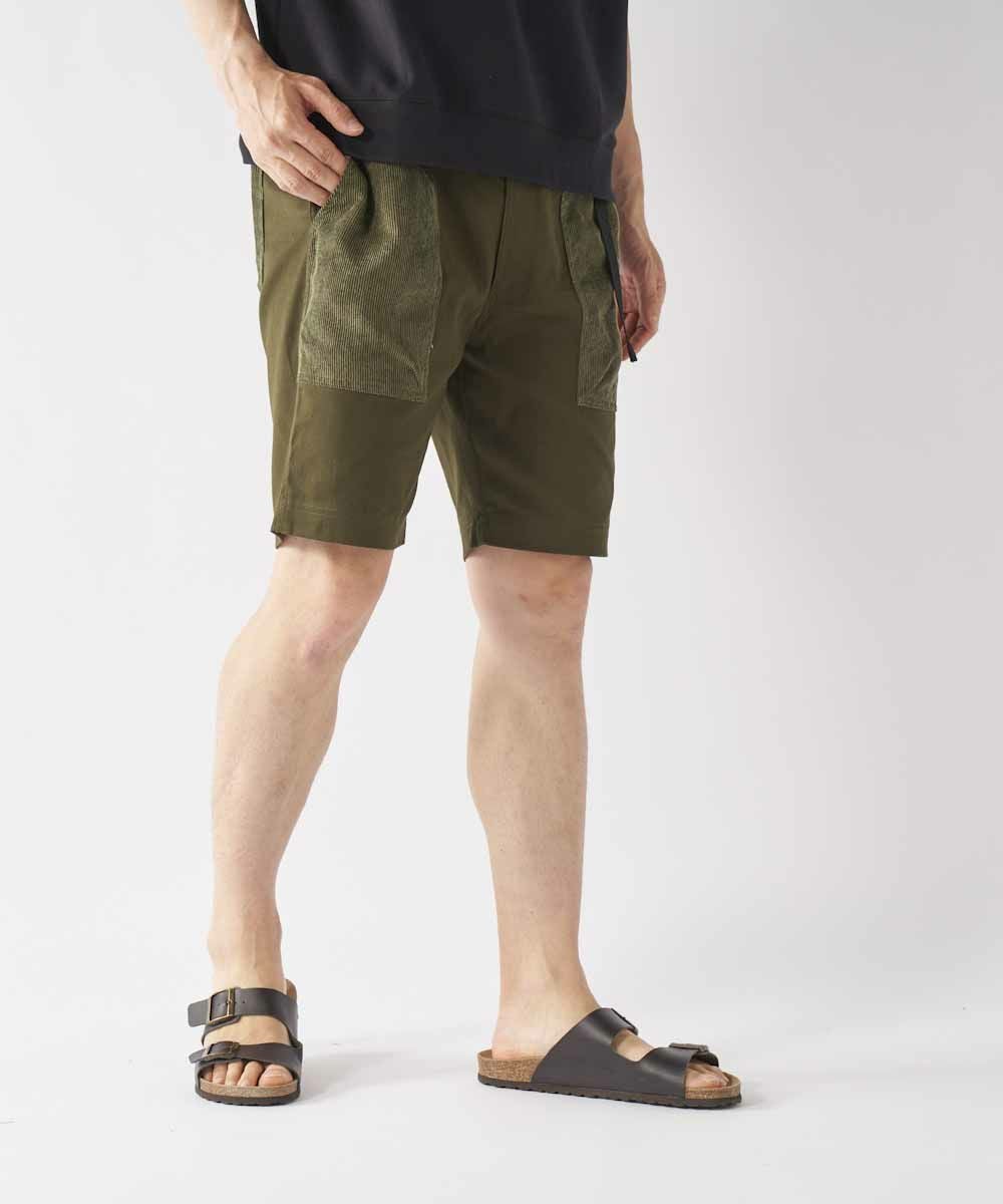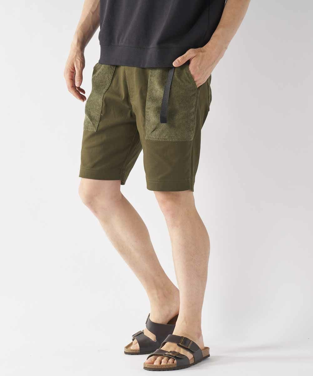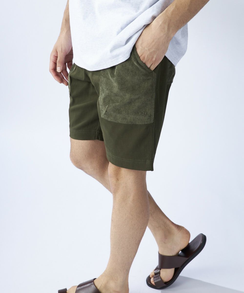 膝上丈の異素材ミックスデザインショートパンツ。